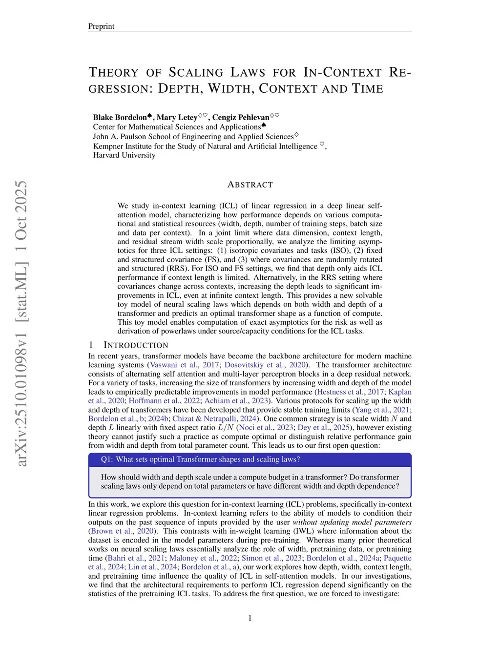 We study in-context learning (ICL) of linear regression in a deep linear self-attention model, characterizing how performance depends on various computational and statistical resources (width, depth, number of training steps, batch size and data per context). In a joint limit where data dimension, context length, and residual stream width scale proportionally, we analyze the limiting asymptotics for three ICL settings: (1) isotropic covariates and tasks (ISO), (2) fixed and structured covariance (FS), and (3) where covariances are randomly rotated and structured (RRS). For ISO and FS settings, we find that depth only aids ICL performance if context length is limited. Alternatively, in the RRS setting where covariances change across contexts, increasing the depth leads to significant improvements in ICL, even at infinite context length. This provides a new solvable toy model of neural scaling laws which depends on both width and depth of a transformer and predicts an optimal transformer shape as a function of compute. This toy model enables computation of exact asymptotics for the risk as well as derivation of powerlaws under source/capacity conditions for the ICL tasks.
