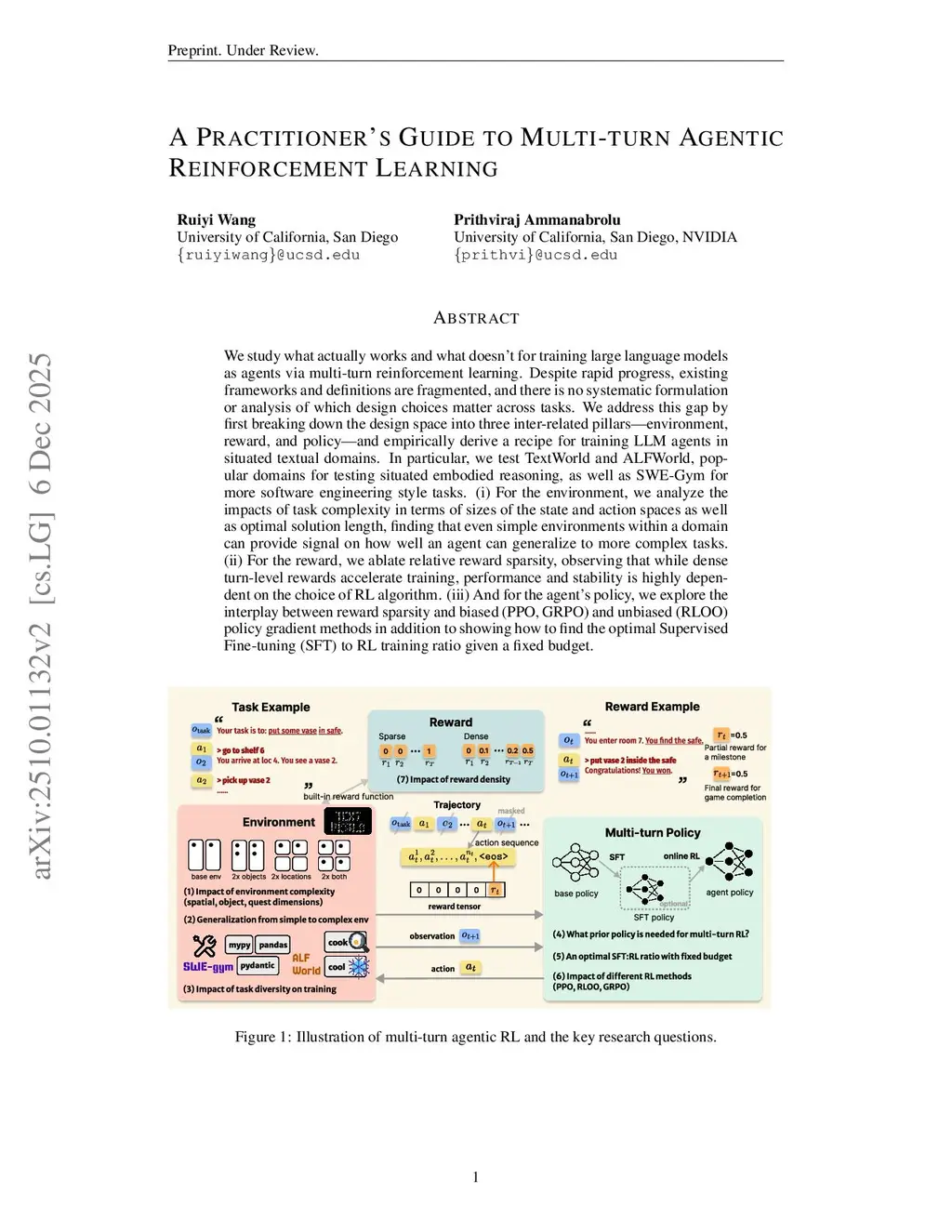 We study what actually works and what doesn't for training large language models as agents via multi-turn reinforcement learning. Despite rapid progress, existing frameworks and definitions are fragmented, and there is no systematic formulation or analysis of which design choices matter across tasks. We address this gap by first breaking down the design space into three inter-related pillars -- environment, reward, and policy -- and empirically derive a recipe for training LLM agents in situated textual domains. In particular, we test TextWorld and ALFWorld, popular domains for testing situated embodied reasoning, as well as SWE-Gym for more software engineering style tasks. (i) For the environment, we analyze the impacts of task complexity in terms of sizes of the state and action spaces as well as optimal solution length, finding that even simple environments within a domain can provide signal on how well an agent can generalize to more complex tasks. (ii) For the reward, we ablate relative reward sparsity, observing that while dense turn-level rewards accelerate training, performance and stability is highly dependent on the choice of RL algorithm. (iii) And for the agent's policy, we explore the interplay between reward sparsity and biased (PPO, GRPO) and unbiased (RLOO) policy gradient methods in addition to showing how to find the optimal Supervised Fine-tuning (SFT) to RL training ratio given a fixed budget. We distill these findings into a training recipe that guides co-design across the three pillars, facilitating research and practical efforts in multi-turn agentic RL. Code:this https URL