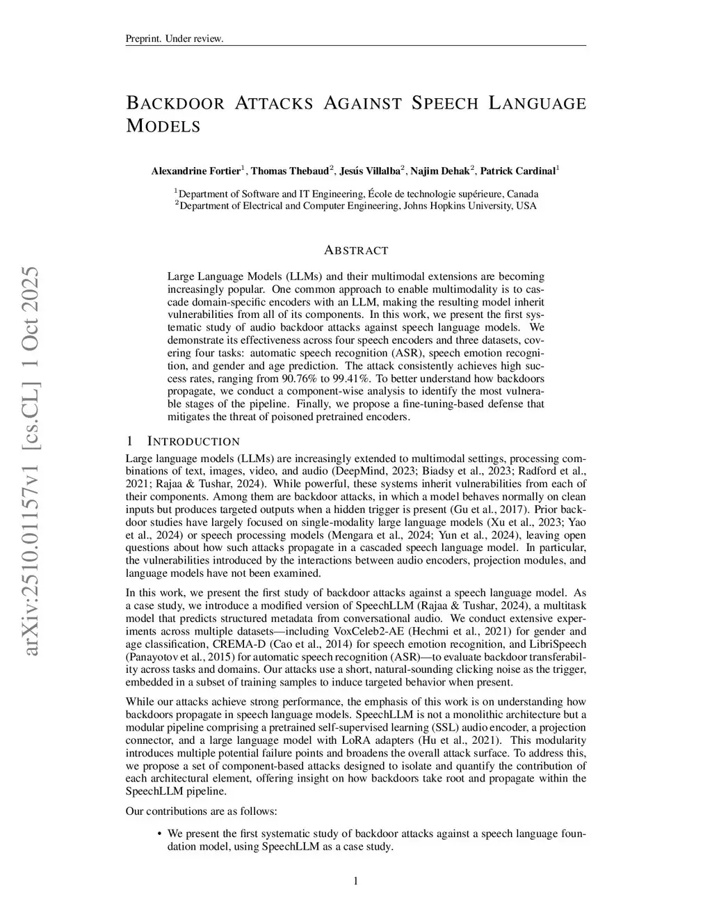 Large Language Models (LLMs) and their multimodal extensions are becoming increasingly popular. One common approach to enable multimodality is to cascade domain-specific encoders with an LLM, making the resulting model inherit vulnerabilities from all of its components. In this work, we present the first systematic study of audio backdoor attacks against speech language models. We demonstrate its effectiveness across four speech encoders and three datasets, covering four tasks: automatic speech recognition (ASR), speech emotion recognition, and gender and age prediction. The attack consistently achieves high success rates, ranging from 90.76% to 99.41%. To better understand how backdoors propagate, we conduct a component-wise analysis to identify the most vulnerable stages of the pipeline. Finally, we propose a fine-tuning-based defense that mitigates the threat of poisoned pretrained encoders.