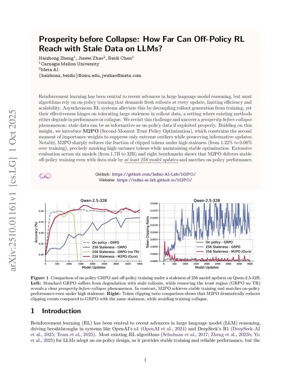 Reinforcement learning has been central to recent advances in large language model reasoning, but most algorithms rely on on-policy training that demands fresh rollouts at every update, limiting efficiency and scalability. Asynchronous RL systems alleviate this by decoupling rollout generation from training, yet their effectiveness hinges on tolerating large staleness in rollout data, a setting where existing methods either degrade in performance or collapse. We revisit this challenge and uncover a prosperity-before-collapse phenomenon: stale data can be as informative as on-policy data if exploited properly. Building on this insight, we introduce M2PO (Second-Moment Trust Policy Optimization), which constrains the second moment of importance weights to suppress only extreme outliers while preserving informative updates. Notably, M2PO sharply reduces the fraction of clipped tokens under high staleness (from 1.22% to 0.06% over training), precisely masking high-variance tokens while maintaining stable optimization. Extensive evaluation across six models (from 1.7B to 32B) and eight benchmarks shows that M2PO delivers stable off-policy training even with data stale by at least 256 model updates and matches on-policy performance.