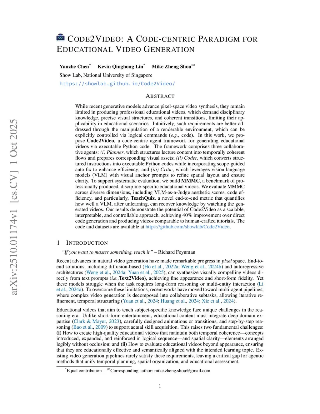 While recent generative models advance pixel-space video synthesis, they remain limited in producing professional educational videos, which demand disciplinary knowledge, precise visual structures, and coherent transitions, limiting their applicability in educational scenarios. Intuitively, such requirements are better addressed through the manipulation of a renderable environment, which can be explicitly controlled via logical commands (e.g., code). In this work, we propose Code2Video, a code-centric agent framework for generating educational videos via executable Python code. The framework comprises three collaborative agents: (i) Planner, which structures lecture content into temporally coherent flows and prepares corresponding visual assets; (ii) Coder, which converts structured instructions into executable Python codes while incorporating scope-guided auto-fix to enhance efficiency; and (iii) Critic, which leverages vision-language models (VLM) with visual anchor prompts to refine spatial layout and ensure clarity. To support systematic evaluation, we build MMMC, a benchmark of professionally produced, discipline-specific educational videos. We evaluate MMMC across diverse dimensions, including VLM-as-a-Judge aesthetic scores, code efficiency, and particularly, TeachQuiz, a novel end-to-end metric that quantifies how well a VLM, after unlearning, can recover knowledge by watching the generated videos. Our results demonstrate the potential of Code2Video as a scalable, interpretable, and controllable approach, achieving 40% improvement over direct code generation and producing videos comparable to human-crafted tutorials. The code and datasets are available atthis https URL.