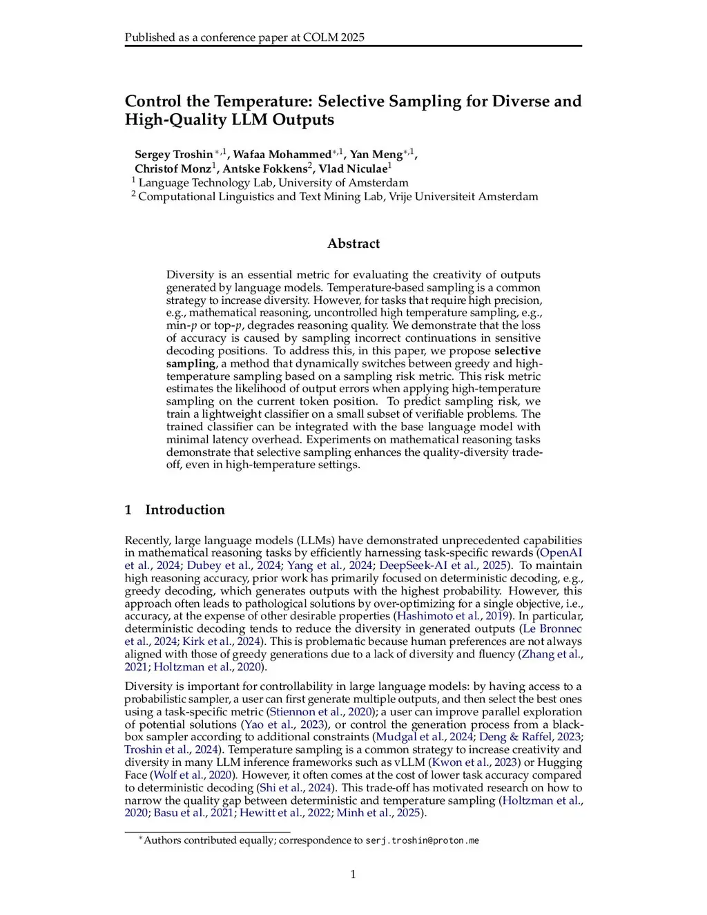 Diversity is an essential metric for evaluating the creativity of outputs generated by language models. Temperature-based sampling is a common strategy to increase diversity. However, for tasks that require high precision, e.g., mathematical reasoning, uncontrolled high temperature sampling, e.g., min- or top-, degrades reasoning quality. We demonstrate that the loss of accuracy is caused by sampling incorrect continuations in sensitive decoding positions. To address this, in this paper, we propose \textbf{selective sampling}, a method that dynamically switches between greedy and high-temperature sampling based on a sampling risk metric. This risk metric estimates the likelihood of output errors when applying high-temperature sampling on the current token position. To predict sampling risk, we train a lightweight classifier on a small subset of verifiable problems. The trained classifier can be integrated with the base language model with minimal latency overhead. Experiments on mathematical reasoning tasks demonstrate that selective sampling enhances the quality-diversity trade-off, even in high-temperature settings.