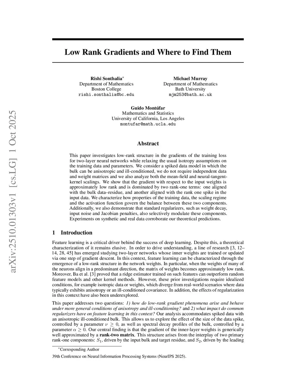 This paper investigates low-rank structure in the gradients of the training loss for two-layer neural networks while relaxing the usual isotropy assumptions on the training data and parameters. We consider a spiked data model in which the bulk can be anisotropic and ill-conditioned, we do not require independent data and weight matrices and we also analyze both the mean-field and neural-tangent-kernel scalings. We show that the gradient with respect to the input weights is approximately low rank and is dominated by two rank-one terms: one aligned with the bulk data-residue , and another aligned with the rank one spike in the input data. We characterize how properties of the training data, the scaling regime and the activation function govern the balance between these two components. Additionally, we also demonstrate that standard regularizers, such as weight decay, input noise and Jacobian penalties, also selectively modulate these components. Experiments on synthetic and real data corroborate our theoretical predictions.