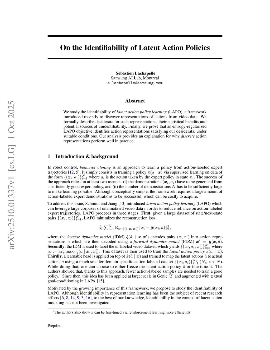 We study the identifiability of latent action policy learning (LAPO), a framework introduced recently to discover representations of actions from video data. We formally describe desiderata for such representations, their statistical benefits and potential sources of unidentifiability. Finally, we prove that an entropy-regularized LAPO objective identifies action representations satisfying our desiderata, under suitable conditions. Our analysis provides an explanation for why discrete action representations perform well in practice.