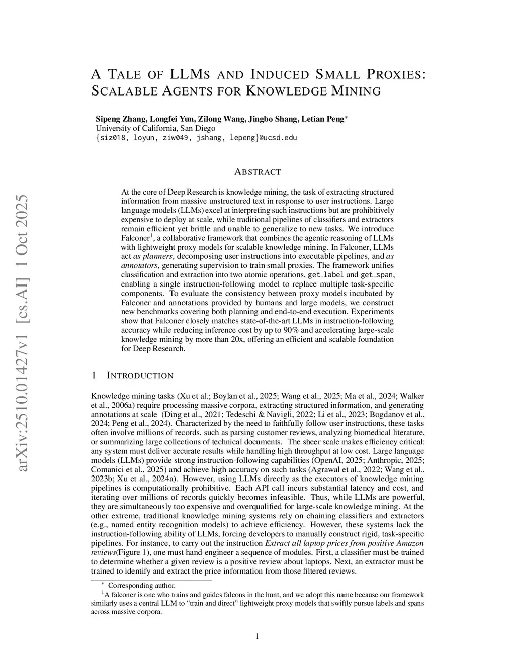 At the core of Deep Research is knowledge mining, the task of extracting structured information from massive unstructured text in response to user instructions. Large language models (LLMs) excel at interpreting such instructions but are prohibitively expensive to deploy at scale, while traditional pipelines of classifiers and extractors remain efficient yet brittle and unable to generalize to new tasks. We introduce Falconer, a collaborative framework that combines the agentic reasoning of LLMs with lightweight proxy models for scalable knowledge mining. In Falconer, LLMs act as planners, decomposing user instructions into executable pipelines, and as annotators, generating supervision to train small proxies. The framework unifies classification and extraction into two atomic operations, get label and get span, enabling a single instruction-following model to replace multiple task-specific components. To evaluate the consistency between proxy models incubated by Falconer and annotations provided by humans and large models, we construct new benchmarks covering both planning and end-to-end execution. Experiments show that Falconer closely matches state-of-the-art LLMs in instruction-following accuracy while reducing inference cost by up to 90% and accelerating large-scale knowledge mining by more than 20x, offering an efficient and scalable foundation for Deep Research.