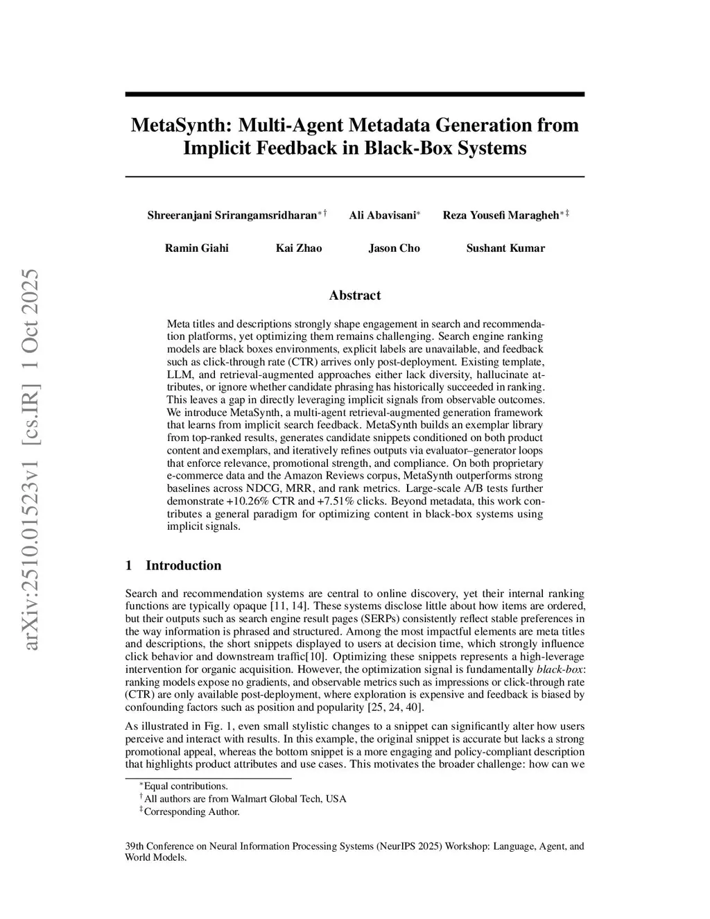 Meta titles and descriptions strongly shape engagement in search and recommendation platforms, yet optimizing them remains challenging. Search engine ranking models are black box environments, explicit labels are unavailable, and feedback such as click-through rate (CTR) arrives only post-deployment. Existing template, LLM, and retrieval-augmented approaches either lack diversity, hallucinate attributes, or ignore whether candidate phrasing has historically succeeded in ranking. This leaves a gap in directly leveraging implicit signals from observable outcomes. We introduce MetaSynth, a multi-agent retrieval-augmented generation framework that learns from implicit search feedback. MetaSynth builds an exemplar library from top-ranked results, generates candidate snippets conditioned on both product content and exemplars, and iteratively refines outputs via evaluator-generator loops that enforce relevance, promotional strength, and compliance. On both proprietary e-commerce data and the Amazon Reviews corpus, MetaSynth outperforms strong baselines across NDCG, MRR, and rank metrics. Large-scale A/B tests further demonstrate 10.26% CTR and 7.51% clicks. Beyond metadata, this work contributes a general paradigm for optimizing content in black-box systems using implicit signals.