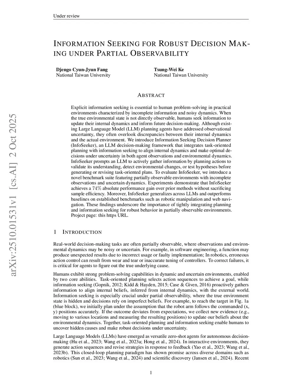 Explicit information seeking is essential to human problem-solving in practical environments characterized by incomplete information and noisy dynamics. When the true environmental state is not directly observable, humans seek information to update their internal dynamics and inform future decision-making. Although existing Large Language Model (LLM) planning agents have addressed observational uncertainty, they often overlook discrepancies between their internal dynamics and the actual environment. We introduce Information Seeking Decision Planner (InfoSeeker), an LLM decision-making framework that integrates task-oriented planning with information seeking to align internal dynamics and make optimal decisions under uncertainty in both agent observations and environmental dynamics. InfoSeeker prompts an LLM to actively gather information by planning actions to validate its understanding, detect environmental changes, or test hypotheses before generating or revising task-oriented plans. To evaluate InfoSeeker, we introduce a novel benchmark suite featuring partially observable environments with incomplete observations and uncertain dynamics. Experiments demonstrate that InfoSeeker achieves a 74% absolute performance gain over prior methods without sacrificing sample efficiency. Moreover, InfoSeeker generalizes across LLMs and outperforms baselines on established benchmarks such as robotic manipulation and web navigation. These findings underscore the importance of tightly integrating planning and information seeking for robust behavior in partially observable environments. The project page is available atthis https URL
