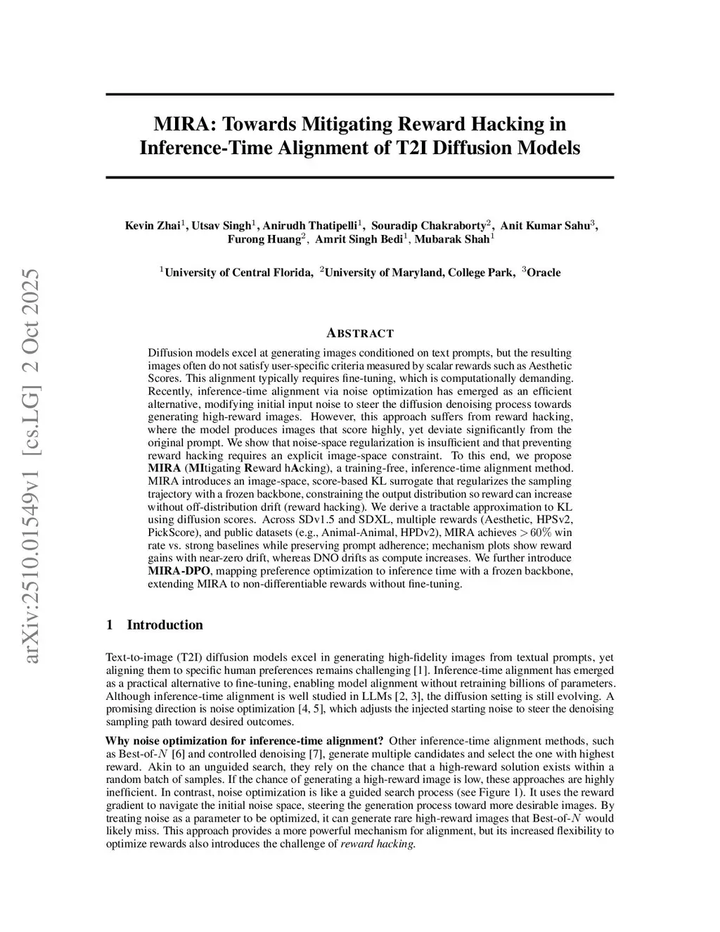 Diffusion models excel at generating images conditioned on text prompts, but the resulting images often do not satisfy user-specific criteria measured by scalar rewards such as Aesthetic Scores. This alignment typically requires fine-tuning, which is computationally demanding. Recently, inference-time alignment via noise optimization has emerged as an efficient alternative, modifying initial input noise to steer the diffusion denoising process towards generating high-reward images. However, this approach suffers from reward hacking, where the model produces images that score highly, yet deviate significantly from the original prompt. We show that noise-space regularization is insufficient and that preventing reward hacking requires an explicit image-space constraint. To this end, we propose MIRA (MItigating Reward hAcking), a training-free, inference-time alignment method. MIRA introduces an image-space, score-based KL surrogate that regularizes the sampling trajectory with a frozen backbone, constraining the output distribution so reward can increase without off-distribution drift (reward hacking). We derive a tractable approximation to KL using diffusion scores. Across SDv1.5 and SDXL, multiple rewards (Aesthetic, HPSv2, PickScore), and public datasets (e.g., Animal-Animal, HPDv2), MIRA achieves >60\% win rate vs. strong baselines while preserving prompt adherence; mechanism plots show reward gains with near-zero drift, whereas DNO drifts as compute increases. We further introduce MIRA-DPO, mapping preference optimization to inference time with a frozen backbone, extending MIRA to non-differentiable rewards without fine-tuning.