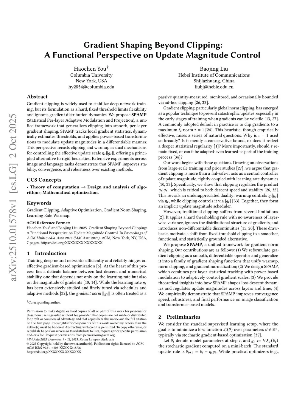 Gradient clipping is widely used to stabilize deep network training, but its formulation as a hard, fixed threshold limits flexibility and ignores gradient distribution dynamics. We propose SPAMP (Statistical Per-layer Adaptive Modulation and Projection), a unified framework that generalizes clipping into smooth, per-layer gradient shaping. SPAMP tracks local gradient statistics, dynamically estimates thresholds, and applies power-based transformations to modulate update magnitudes in a differentiable manner. This perspective recasts clipping and warmup as dual mechanisms for controlling the effective update scale , offering a principled alternative to rigid heuristics. Extensive experiments across image and language tasks demonstrate that SPAMP improves stability, convergence, and robustness over existing methods.
