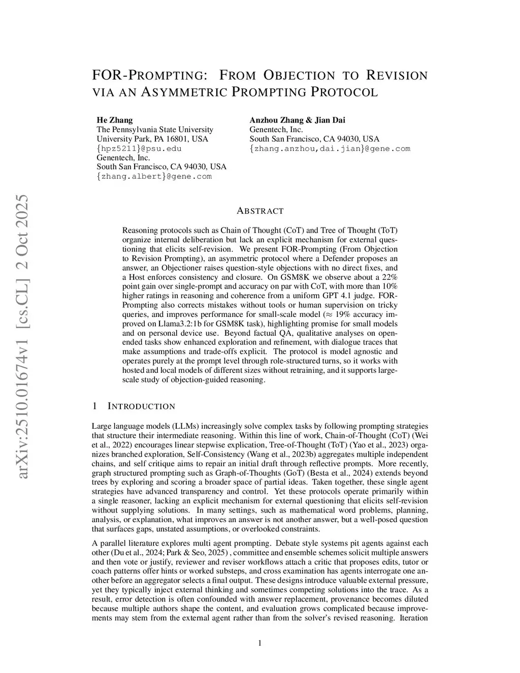 Reasoning protocols such as Chain of Thought (CoT) and Tree of Thought (ToT) organize internal deliberation but lack an explicit mechanism for external questioning that elicits self-revision. We present FOR-Prompting (From Objection to Revision Prompting), an asymmetric protocol where a Defender proposes an answer, an Objectioner raises question-style objections with no direct fixes, and a Host enforces consistency and closure. On GSM8K we observe about a 22% point gain over single-prompt and accuracy on par with CoT, with more than 10% higher ratings in reasoning and coherence from a uniform GPT 4.1 judge. FOR-Prompting also corrects mistakes without tools or human supervision on tricky queries, and improves performance for small-scale model (approx. 19% accuracy improved on Llama3.2:1b for GSM8K task), highlighting promise for small models and on personal device use. Beyond factual QA, qualitative analyses on open-ended tasks show enhanced exploration and refinement, with dialogue traces that make assumptions and trade-offs explicit. The protocol is model agnostic and operates purely at the prompt level through role-structured turns, so it works with hosted and local models of different sizes without retraining, and it supports large-scale study of objection-guided reasoning.
