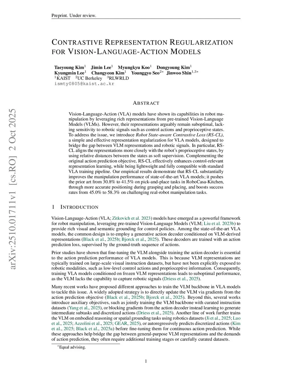 Vision-Language-Action (VLA) models have shown its capabilities in robot manipulation by leveraging rich representations from pre-trained Vision-Language Models (VLMs). However, their representations arguably remain suboptimal, lacking sensitivity to robotic signals such as control actions and proprioceptive states. To address the issue, we introduce Robot State-aware Contrastive Loss (RS-CL), a simple and effective representation regularization for VLA models, designed to bridge the gap between VLM representations and robotic signals. In particular, RS-CL aligns the representations more closely with the robot's proprioceptive states, by using relative distances between the states as soft supervision. Complementing the original action prediction objective, RS-CL effectively enhances control-relevant representation learning, while being lightweight and fully compatible with standard VLA training pipeline. Our empirical results demonstrate that RS-CL substantially improves the manipulation performance of state-of-the-art VLA models; it pushes the prior art from 30.8% to 41.5% on pick-and-place tasks in RoboCasa-Kitchen, through more accurate positioning during grasping and placing, and boosts success rates from 45.0% to 58.3% on challenging real-robot manipulation tasks.