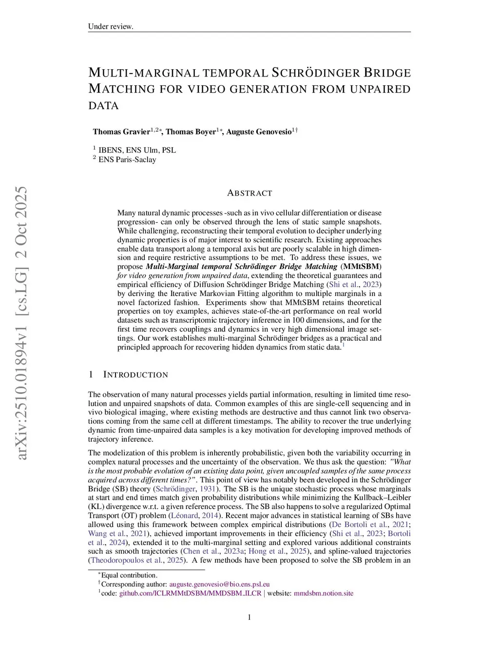 Many natural dynamic processes -- such as in vivo cellular differentiation or disease progression -- can only be observed through the lens of static sample snapshots. While challenging, reconstructing their temporal evolution to decipher underlying dynamic properties is of major interest to scientific research. Existing approaches enable data transport along a temporal axis but are poorly scalable in high dimension and require restrictive assumptions to be met. To address these issues, we propose Multi-Marginal temporal Schrödinger Bridge Matching (MMtSBM) from unpaired data, extending the theoretical guarantees and empirical efficiency of Diffusion Schrödinger Bridge Matching (arXiv:2303.16852) by deriving the Iterative Markovian Fitting algorithm to multiple marginals in a novel factorized fashion. Experiments show that MMtSBM retains theoretical properties on toy examples, achieves state-of-the-art performance on real-world datasets such as transcriptomic trajectory inference in 100 dimensions, and, for the first time, recovers couplings and dynamics in very high-dimensional image settings. Our work establishes multi-marginal Schrödinger bridges as a practical and principled approach for recovering hidden dynamics from static data.