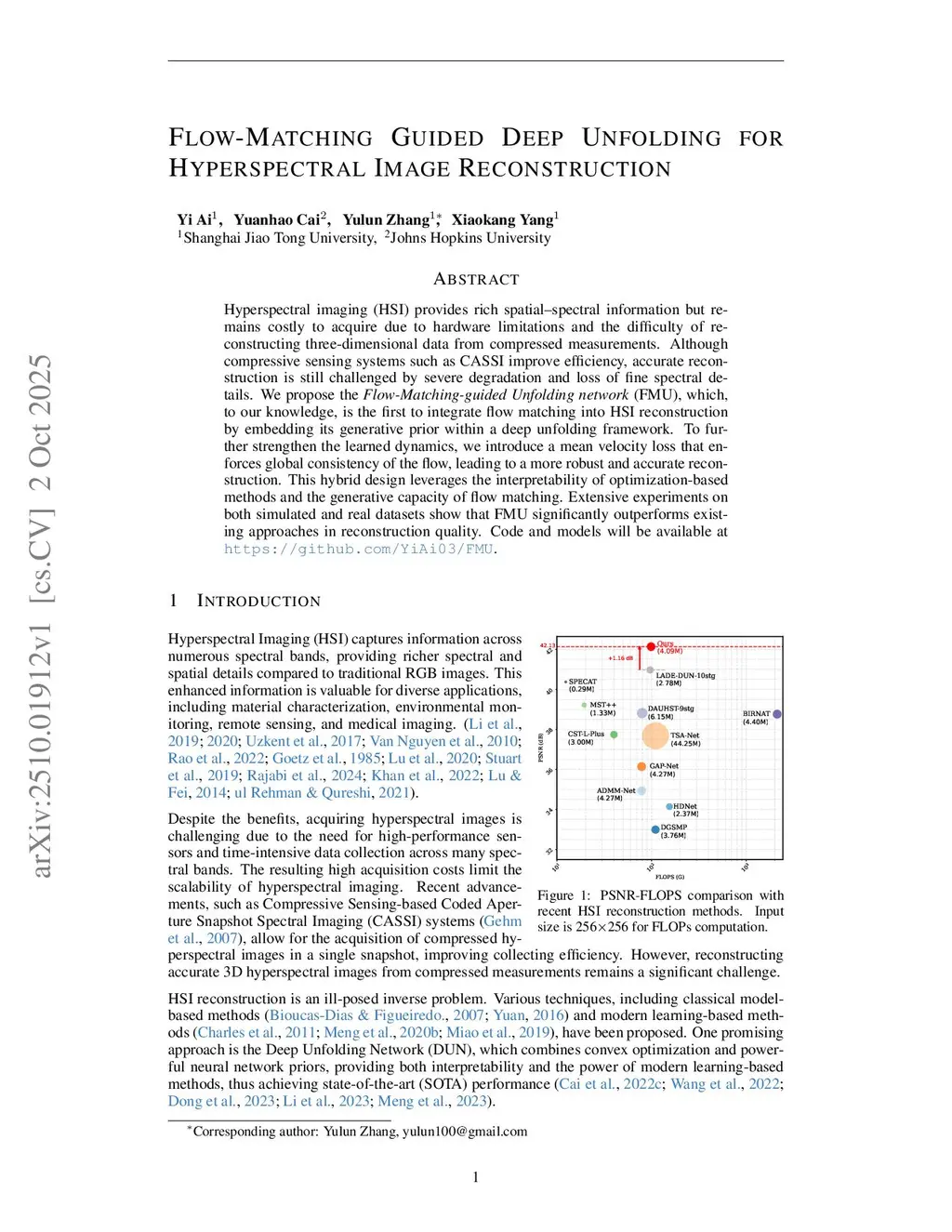 Hyperspectral imaging (HSI) provides rich spatial-spectral information but remains costly to acquire due to hardware limitations and the difficulty of reconstructing three-dimensional data from compressed measurements. Although compressive sensing systems such as CASSI improve efficiency, accurate reconstruction is still challenged by severe degradation and loss of fine spectral details. We propose the Flow-Matching-guided Unfolding network (FMU), which, to our knowledge, is the first to integrate flow matching into HSI reconstruction by embedding its generative prior within a deep unfolding framework. To further strengthen the learned dynamics, we introduce a mean velocity loss that enforces global consistency of the flow, leading to a more robust and accurate reconstruction. This hybrid design leverages the interpretability of optimization-based methods and the generative capacity of flow matching. Extensive experiments on both simulated and real datasets show that FMU significantly outperforms existing approaches in reconstruction quality. Code and models will be available atthis https URL.