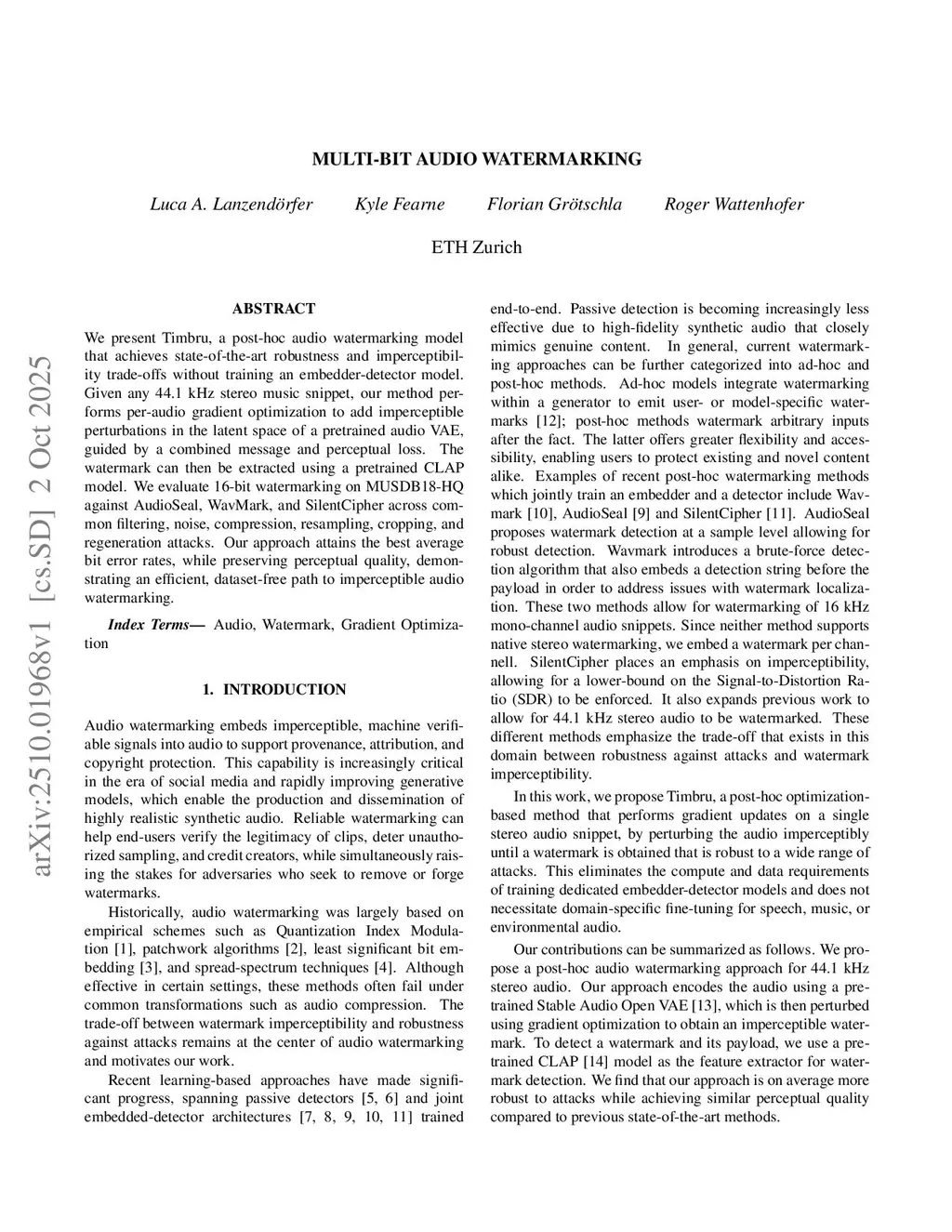 We present Timbru, a post-hoc audio watermarking model that achieves state-of-the-art robustness and imperceptibility trade-offs without training an embedder-detector model. Given any 44.1 kHz stereo music snippet, our method performs per-audio gradient optimization to add imperceptible perturbations in the latent space of a pretrained audio VAE, guided by a combined message and perceptual loss. The watermark can then be extracted using a pretrained CLAP model. We evaluate 16-bit watermarking on MUSDB18-HQ against AudioSeal, WavMark, and SilentCipher across common filtering, noise, compression, resampling, cropping, and regeneration attacks. Our approach attains the best average bit error rates, while preserving perceptual quality, demonstrating an efficient, dataset-free path to imperceptible audio watermarking.