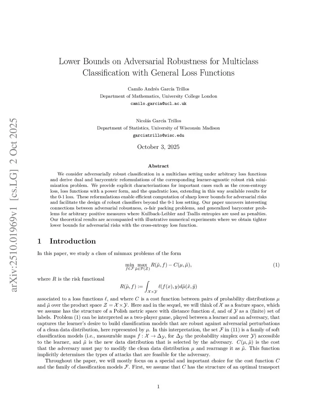 We consider adversarially robust classification in a multiclass setting under arbitrary loss functions and derive dual and barycentric reformulations of the corresponding learner-agnostic robust risk minimization problem. We provide explicit characterizations for important cases such as the cross-entropy loss, loss functions with a power form, and the quadratic loss, extending in this way available results for the 0-1 loss. These reformulations enable efficient computation of sharp lower bounds for adversarial risks and facilitate the design of robust classifiers beyond the 0-1 loss setting. Our paper uncovers interesting connections between adversarial robustness, -fair packing problems, and generalized barycenter problems for arbitrary positive measures where Kullback-Leibler and Tsallis entropies are used as penalties. Our theoretical results are accompanied with illustrative numerical experiments where we obtain tighter lower bounds for adversarial risks with the cross-entropy loss function.