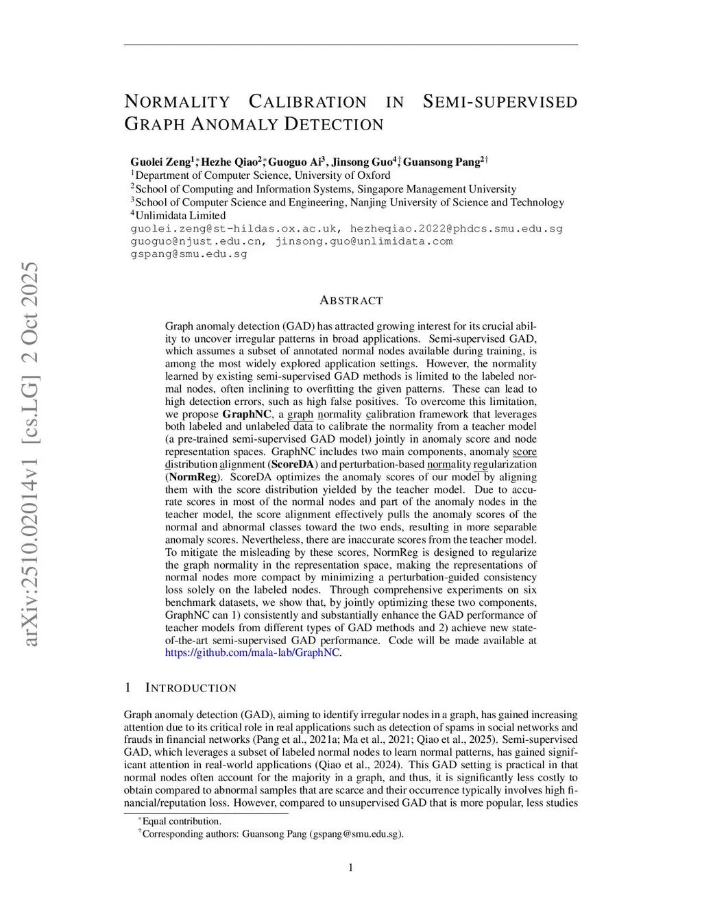 Graph anomaly detection (GAD) has attracted growing interest for its crucial ability to uncover irregular patterns in broad applications. Semi-supervised GAD, which assumes a subset of annotated normal nodes available during training, is among the most widely explored application settings. However, the normality learned by existing semi-supervised GAD methods is limited to the labeled normal nodes, often inclining to overfitting the given patterns. These can lead to high detection errors, such as high false positives. To overcome this limitation, we propose GraphNC , a graph normality calibration framework that leverages both labeled and unlabeled data to calibrate the normality from a teacher model (a pre-trained semi-supervised GAD model) jointly in anomaly score and node representation spaces. GraphNC includes two main components, anomaly score distribution alignment (ScoreDA) and perturbation-based normality regularization (NormReg). ScoreDA optimizes the anomaly scores of our model by aligning them with the score distribution yielded by the teacher model. Due to accurate scores in most of the normal nodes and part of the anomaly nodes in the teacher model, the score alignment effectively pulls the anomaly scores of the normal and abnormal classes toward the two ends, resulting in more separable anomaly scores. Nevertheless, there are inaccurate scores from the teacher model. To mitigate the misleading by these scores, NormReg is designed to regularize the graph normality in the representation space, making the representations of normal nodes more compact by minimizing a perturbation-guided consistency loss solely on the labeled nodes.