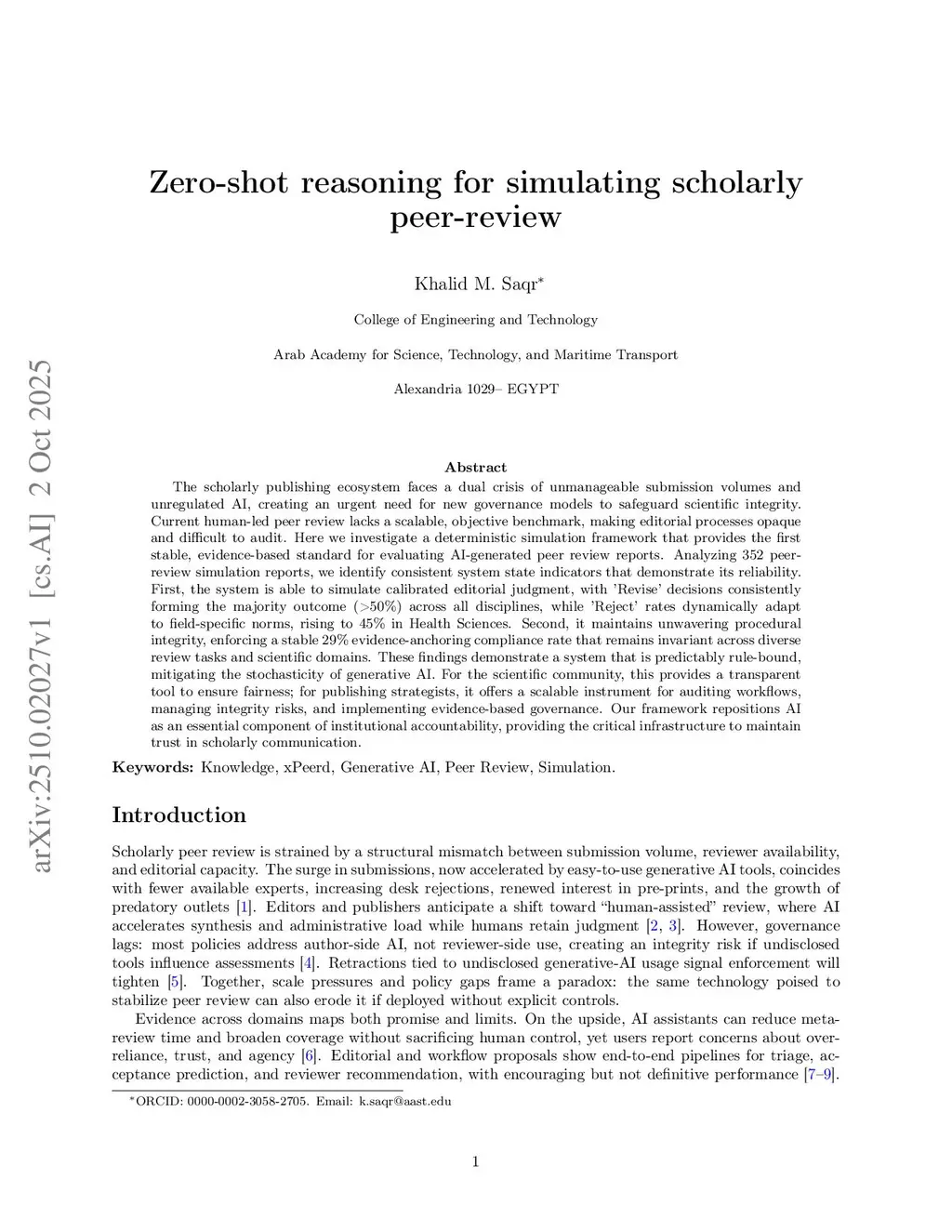 The scholarly publishing ecosystem faces a dual crisis of unmanageable submission volumes and unregulated AI, creating an urgent need for new governance models to safeguard scientific integrity. The traditional human-only peer review regime lacks a scalable, objective benchmark, making editorial processes opaque and difficult to audit. Here we investigate a deterministic simulation framework that provides the first stable, evidence-based standard for evaluating AI-generated peer review reports. Analyzing 352 peer-review simulation reports, we identify consistent system state indicators that demonstrate its reliability. First, the system is able to simulate calibrated editorial judgment, with 'Revise' decisions consistently forming the majority outcome (>50%) across all disciplines, while 'Reject' rates dynamically adapt to field-specific norms, rising to 45% in Health Sciences. Second, it maintains unwavering procedural integrity, enforcing a stable 29% evidence-anchoring compliance rate that remains invariant across diverse review tasks and scientific domains. These findings demonstrate a system that is predictably rule-bound, mitigating the stochasticity of generative AI. For the scientific community, this provides a transparent tool to ensure fairness; for publishing strategists, it offers a scalable instrument for auditing workflows, managing integrity risks, and implementing evidence-based governance. The framework repositions AI as an essential component of institutional accountability, providing the critical infrastructure to maintain trust in scholarly communication.