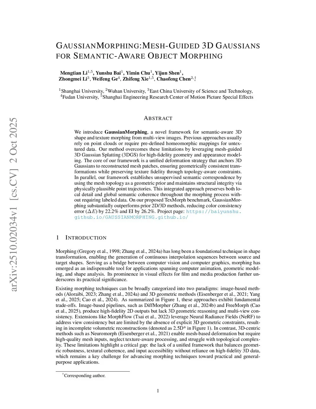 We introduce GaussianMorphing, a novel framework for semantic-aware 3D shape and texture morphing from multi-view images. Previous approaches usually rely on point clouds or require pre-defined homeomorphic mappings for untextured data. Our method overcomes these limitations by leveraging mesh-guided 3D Gaussian Splatting (3DGS) for high-fidelity geometry and appearance modeling. The core of our framework is a unified deformation strategy that anchors 3DGaussians to reconstructed mesh patches, ensuring geometrically consistent transformations while preserving texture fidelity through topology-aware constraints. In parallel, our framework establishes unsupervised semantic correspondence by using the mesh topology as a geometric prior and maintains structural integrity via physically plausible point trajectories. This integrated approach preserves both local detail and global semantic coherence throughout the morphing process with out requiring labeled data. On our proposed TexMorph benchmark, GaussianMorphing substantially outperforms prior 2D/3D methods, reducing color consistency error () by 22.2% and EI by 26.2%. Project page:this https URL