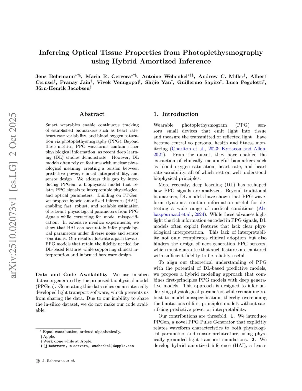 Smart wearables enable continuous tracking of established biomarkers such as heart rate, heart rate variability, and blood oxygen saturation via photoplethysmography (PPG). Beyond these metrics, PPG waveforms contain richer physiological information, as recent deep learning (DL) studies demonstrate. However, DL models often rely on features with unclear physiological meaning, creating a tension between predictive power, clinical interpretability, and sensor design. We address this gap by introducing PPGen, a biophysical model that relates PPG signals to interpretable physiological and optical parameters. Building on PPGen, we propose hybrid amortized inference (HAI), enabling fast, robust, and scalable estimation of relevant physiological parameters from PPG signals while correcting for model misspecification. In extensive in-silico experiments, we show that HAI can accurately infer physiological parameters under diverse noise and sensor conditions. Our results illustrate a path toward PPG models that retain the fidelity needed for DL-based features while supporting clinical interpretation and informed hardware design.