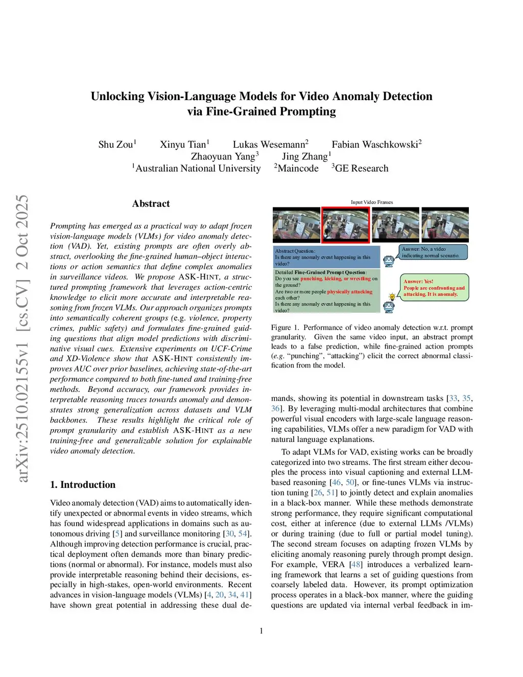 Prompting has emerged as a practical way to adapt frozen vision-language models (VLMs) for video anomaly detection (VAD). Yet, existing prompts are often overly abstract, overlooking the fine-grained human-object interactions or action semantics that define complex anomalies in surveillance videos. We propose ASK-Hint, a structured prompting framework that leverages action-centric knowledge to elicit more accurate and interpretable reasoning from frozen VLMs. Our approach organizes prompts into semantically coherent groups (e.g. violence, property crimes, public safety) and formulates fine-grained guiding questions that align model predictions with discriminative visual cues. Extensive experiments on UCF-Crime and XD-Violence show that ASK-Hint consistently improves AUC over prior baselines, achieving state-of-the-art performance compared to both fine-tuned and training-free methods. Beyond accuracy, our framework provides interpretable reasoning traces towards anomaly and demonstrates strong generalization across datasets and VLM backbones. These results highlight the critical role of prompt granularity and establish ASK-Hint as a new training-free and generalizable solution for explainable video anomaly detection.