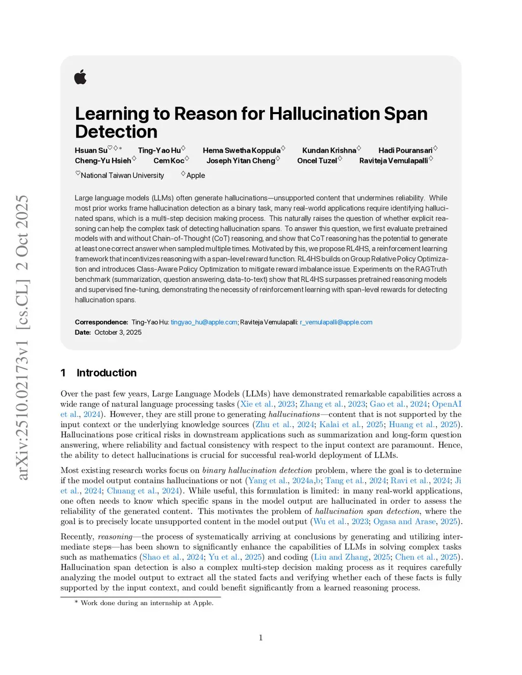 Large language models (LLMs) often generate hallucinations -- unsupported content that undermines reliability. While most prior works frame hallucination detection as a binary task, many real-world applications require identifying hallucinated spans, which is a multi-step decision making process. This naturally raises the question of whether explicit reasoning can help the complex task of detecting hallucination spans. To answer this question, we first evaluate pretrained models with and without Chain-of-Thought (CoT) reasoning, and show that CoT reasoning has the potential to generate at least one correct answer when sampled multiple times. Motivated by this, we propose RL4HS, a reinforcement learning framework that incentivizes reasoning with a span-level reward function. RL4HS builds on Group Relative Policy Optimization and introduces Class-Aware Policy Optimization to mitigate reward imbalance issue. Experiments on the RAGTruth benchmark (summarization, question answering, data-to-text) show that RL4HS surpasses pretrained reasoning models and supervised fine-tuning, demonstrating the necessity of reinforcement learning with span-level rewards for detecting hallucination spans.