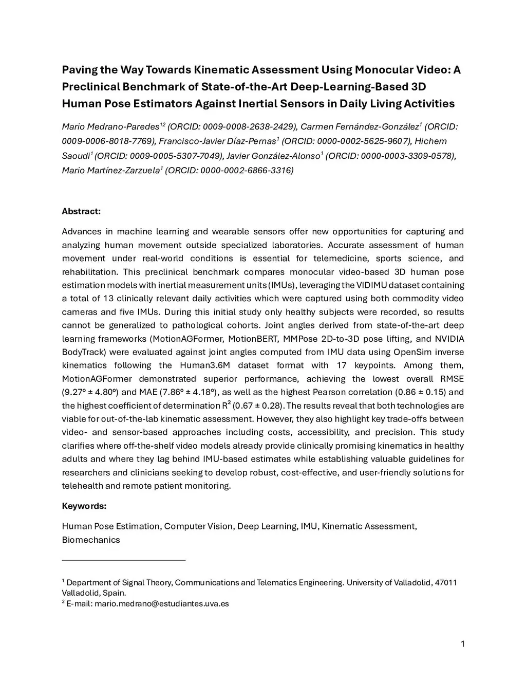 Advances in machine learning and wearable sensors offer new opportunities for capturing and analyzing human movement outside specialized laboratories. Accurate assessment of human movement under real-world conditions is essential for telemedicine, sports science, and rehabilitation. This preclinical benchmark compares monocular video-based 3D human pose estimation models with inertial measurement units (IMUs), leveraging the VIDIMU dataset containing a total of 13 clinically relevant daily activities which were captured using both commodity video cameras and five IMUs. During this initial study only healthy subjects were recorded, so results cannot be generalized to pathological cohorts. Joint angles derived from state-of-the-art deep learning frameworks (MotionAGFormer, MotionBERT, MMPose 2D-to-3D pose lifting, and NVIDIA BodyTrack) were evaluated against joint angles computed from IMU data using OpenSim inverse kinematics following the Human3.6M dataset format with 17 keypoints. Among them, MotionAGFormer demonstrated superior performance, achieving the lowest overall RMSE () and MAE (), as well as the highest Pearson correlation () and the highest coefficient of determination (). The results reveal that both technologies are viable for out-of-the-lab kinematic assessment. However, they also highlight key trade-offs between video- and sensor-based approaches including costs, accessibility, and precision. This study clarifies where off-the-shelf video models already provide clinically promising kinematics in healthy adults and where they lag behind IMU-based estimates while establishing valuable guidelines for researchers and clinicians seeking to develop robust, cost-effective, and user-friendly solutions for telehealth and remote patient monitoring.