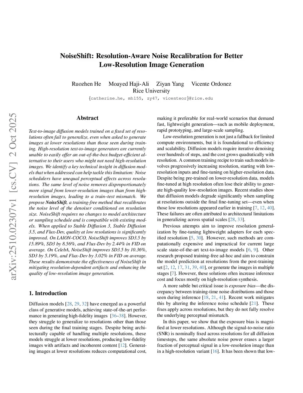 Text-to-image diffusion models trained on a fixed set of resolutions often fail to generalize, even when asked to generate images at lower resolutions than those seen during training. High-resolution text-to-image generators are currently unable to easily offer an out-of-the-box budget-efficient alternative to their users who might not need high-resolution images. We identify a key technical insight in diffusion models that when addressed can help tackle this limitation: Noise schedulers have unequal perceptual effects across resolutions. The same level of noise removes disproportionately more signal from lower-resolution images than from high-resolution images, leading to a train-test mismatch. We propose NoiseShift, a training-free method that recalibrates the noise level of the denoiser conditioned on resolution size. NoiseShift requires no changes to model architecture or sampling schedule and is compatible with existing models. When applied to Stable Diffusion 3, Stable Diffusion 3.5, and Flux-Dev, quality at low resolutions is significantly improved. On LAION-COCO, NoiseShift improves SD3.5 by 15.89%, SD3 by 8.56%, and Flux-Dev by 2.44% in FID on average. On CelebA, NoiseShift improves SD3.5 by 10.36%, SD3 by 5.19%, and Flux-Dev by 3.02% in FID on average. These results demonstrate the effectiveness of NoiseShift in mitigating resolution-dependent artifacts and enhancing the quality of low-resolution image generation.