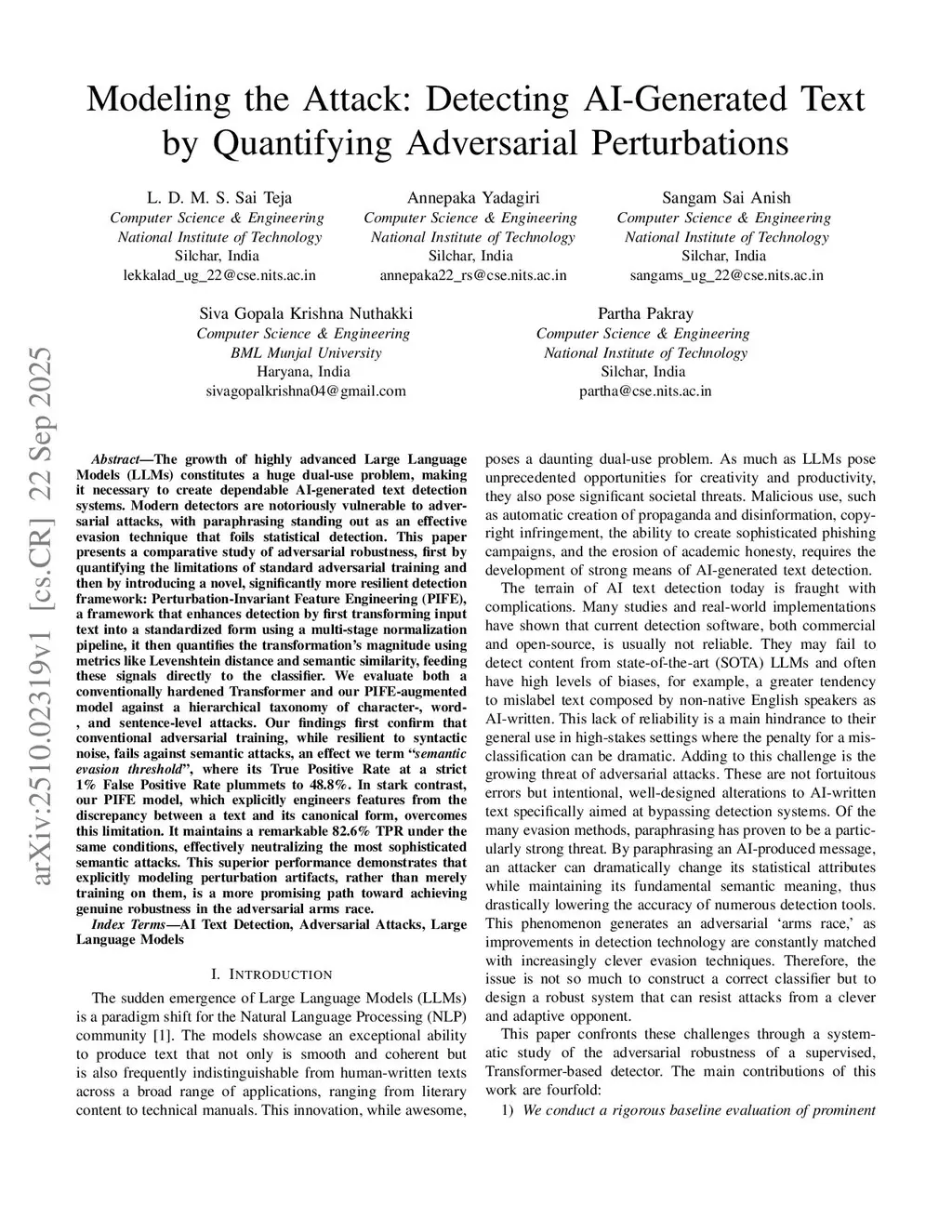 The growth of highly advanced Large Language Models (LLMs) constitutes a huge dual-use problem, making it necessary to create dependable AI-generated text detection systems. Modern detectors are notoriously vulnerable to adversarial attacks, with paraphrasing standing out as an effective evasion technique that foils statistical detection. This paper presents a comparative study of adversarial robustness, first by quantifying the limitations of standard adversarial training and then by introducing a novel, significantly more resilient detection framework: Perturbation-Invariant Feature Engineering (PIFE), a framework that enhances detection by first transforming input text into a standardized form using a multi-stage normalization pipeline, it then quantifies the transformation's magnitude using metrics like Levenshtein distance and semantic similarity, feeding these signals directly to the classifier. We evaluate both a conventionally hardened Transformer and our PIFE-augmented model against a hierarchical taxonomy of character-, word-, and sentence-level attacks. Our findings first confirm that conventional adversarial training, while resilient to syntactic noise, fails against semantic attacks, an effect we term "semantic evasion threshold", where its True Positive Rate at a strict 1% False Positive Rate plummets to 48.8%. In stark contrast, our PIFE model, which explicitly engineers features from the discrepancy between a text and its canonical form, overcomes this limitation. It maintains a remarkable 82.6% TPR under the same conditions, effectively neutralizing the most sophisticated semantic attacks. This superior performance demonstrates that explicitly modeling perturbation artifacts, rather than merely training on them, is a more promising path toward achieving genuine robustness in the adversarial arms race.