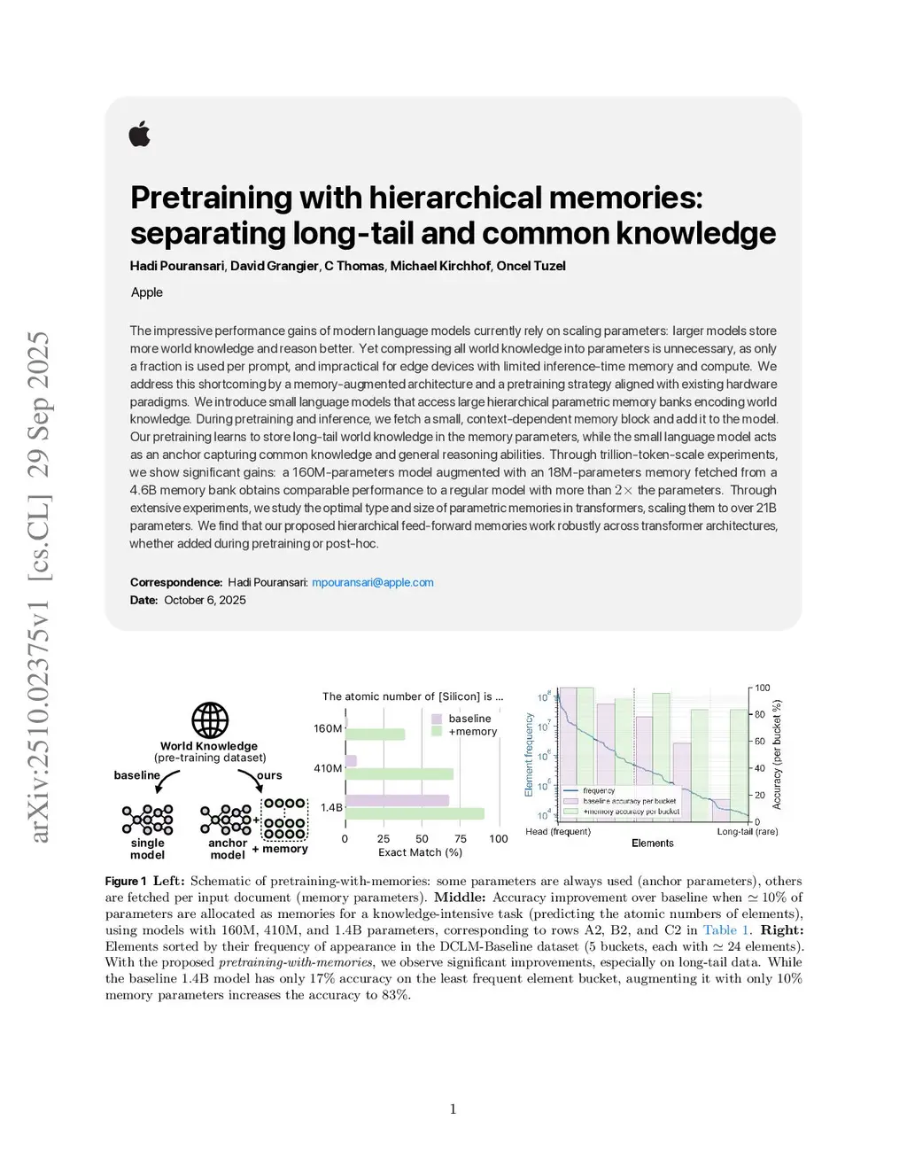 Pretraining with hierarchical memories: separating long-tail and common knowledge