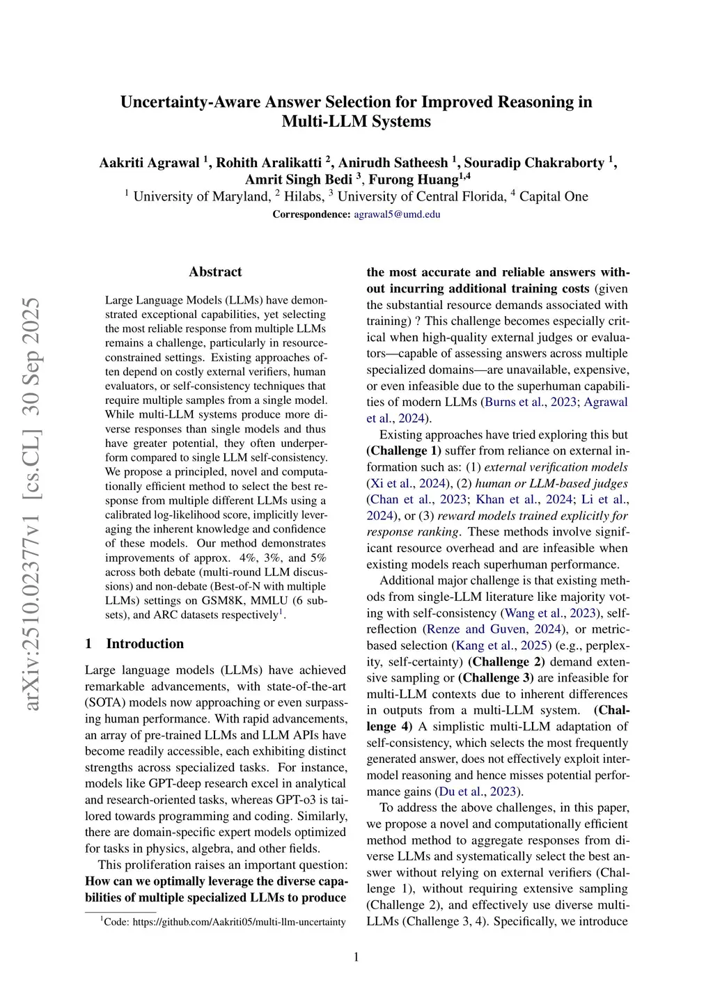 Large Language Models (LLMs) have demonstrated exceptional capabilities, yet selecting the most reliable response from multiple LLMs remains a challenge, particularly in resource-constrained settings. Existing approaches often depend on costly external verifiers, human evaluators, or self-consistency techniques that require multiple samples from a single model. While multi-LLM systems produce more diverse responses than single models and thus have greater potential, they often underperform compared to single LLM self-consistency. We propose a principled, novel and computationally efficient method to select the best response from multiple different LLMs using a calibrated log-likelihood score, implicitly leveraging the inherent knowledge and confidence of these models. Our method demonstrates improvements of approx. 4%, 3%, and 5% across both debate (multi-round LLM discussions) and non-debate (Best-of-N with multiple LLMs) settings on GSM8K, MMLU (6 subsets), and ARC datasets respectively.