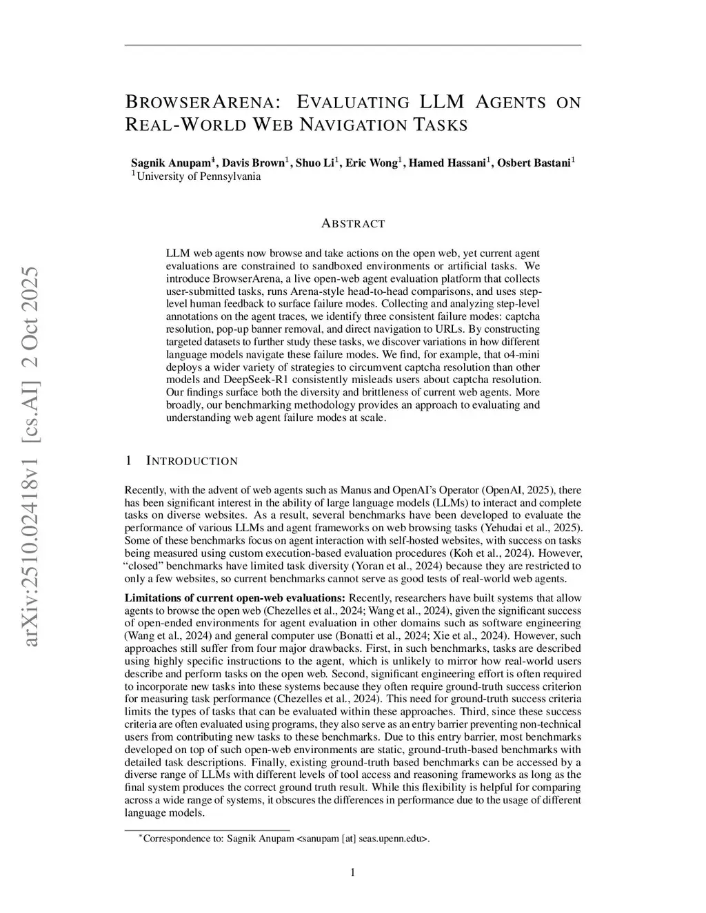 LLM web agents now browse and take actions on the open web, yet current agent evaluations are constrained to sandboxed environments or artificial tasks. We introduce BrowserArena, a live open-web agent evaluation platform that collects user-submitted tasks, runs Arena-style head-to-head comparisons, and uses step-level human feedback to surface failure modes. Collecting and analyzing step-level annotations on the agent traces, we identify three consistent failure modes: captcha resolution, pop-up banner removal, and direct navigation to URLs. By constructing targeted datasets to further study these tasks, we discover variations in how different language models navigate these failure modes. We find, for example, that o4-mini deploys a wider variety of strategies to circumvent captcha resolution than other models and DeepSeek-R1 consistently misleads users about pop-up banner closure. Our findings surface both the diversity and brittleness of current web agents. More broadly, our benchmarking methodology provides an approach to evaluating and understanding web agent failure modes at scale.