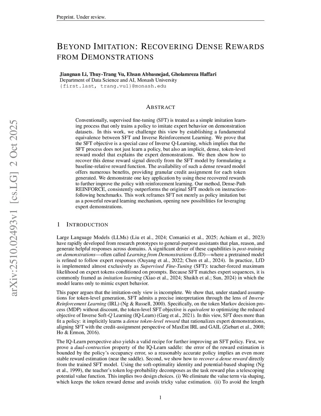 Conventionally, supervised fine-tuning (SFT) is treated as a simple imitation learning process that only trains a policy to imitate expert behavior on demonstration datasets. In this work, we challenge this view by establishing a fundamental equivalence between SFT and Inverse Reinforcement Learning. We prove that the SFT objective is a special case of Inverse Q-Learning, which implies that the SFT process does not just learn a policy, but also an implicit, dense, token-level reward model that explains the expert demonstrations. We then show how to recover this dense reward signal directly from the SFT model by formulating a baseline-relative reward function. The availability of such a dense reward model offers numerous benefits, providing granular credit assignment for each token generated. We demonstrate one key application by using these recovered rewards to further improve the policy with reinforcement learning. Our method, Dense-Path REINFORCE, consistently outperforms the original SFT models on instruction-following benchmarks. This work reframes SFT not merely as policy imitation but as a powerful reward learning mechanism, opening new possibilities for leveraging expert demonstrations.
