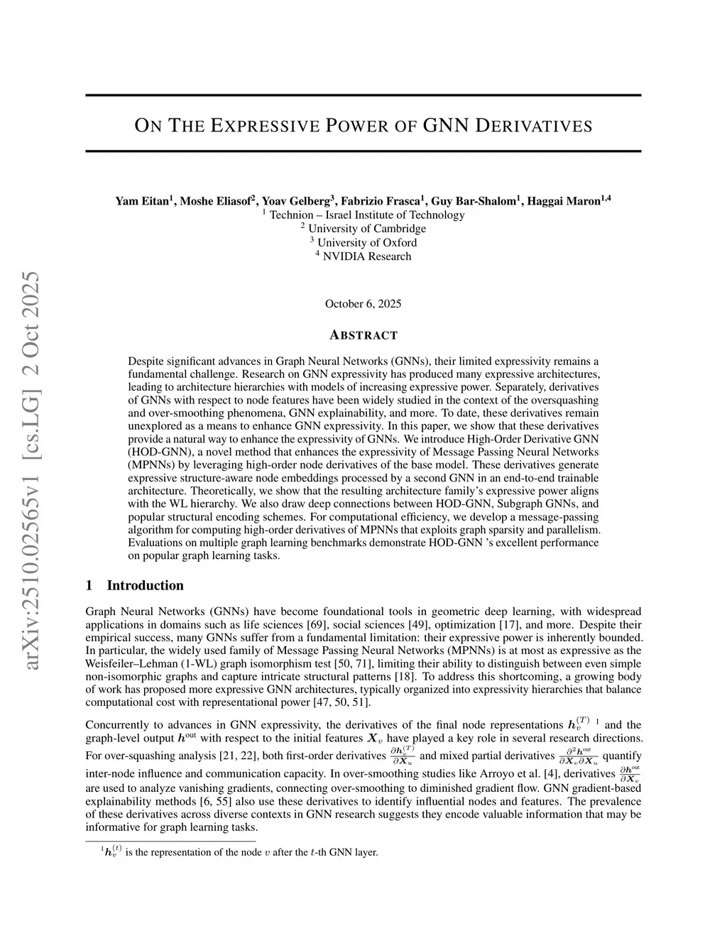 Despite significant advances in Graph Neural Networks (GNNs), their limited expressivity remains a fundamental challenge. Research on GNN expressivity has produced many expressive architectures, leading to architecture hierarchies with models of increasing expressive power. Separately, derivatives of GNNs with respect to node features have been widely studied in the context of the oversquashing and over-smoothing phenomena, GNN explainability, and more. To date, these derivatives remain unexplored as a means to enhance GNN expressivity. In this paper, we show that these derivatives provide a natural way to enhance the expressivity of GNNs. We introduce High-Order Derivative GNN (HOD-GNN), a novel method that enhances the expressivity of Message Passing Neural Networks (MPNNs) by leveraging high-order node derivatives of the base model. These derivatives generate expressive structure-aware node embeddings processed by a second GNN in an end-to-end trainable architecture. Theoretically, we show that the resulting architecture family's expressive power aligns with the WL hierarchy. We also draw deep connections between HOD-GNN, Subgraph GNNs, and popular structural encoding schemes. For computational efficiency, we develop a message-passing algorithm for computing high-order derivatives of MPNNs that exploits graph sparsity and parallelism. Evaluations on popular graph learning benchmarks demonstrate HOD-GNN's strong performance on popular graph learning tasks.