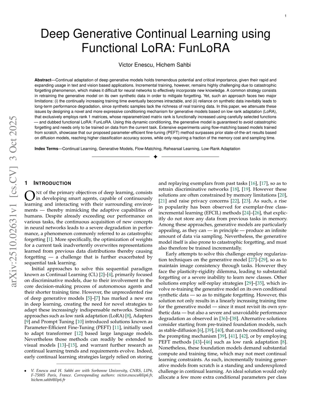 Deep Generative Continual Learning using Functional LoRA: FunLoRA