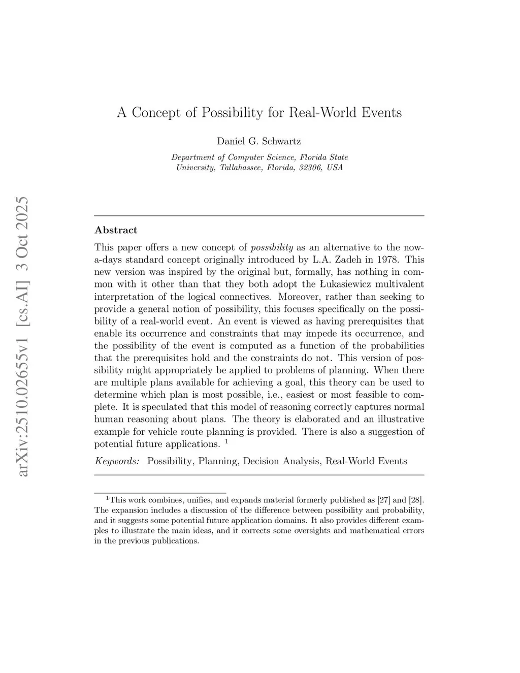This paper offers a new concept of {\it possibility} as an alternative to the now-a-days standard concept originally introduced by L.A. Zadeh in 1978. This new version was inspired by the original but, formally, has nothing in common with it other than that they both adopt the Łukasiewicz multivalent interpretation of the logical connectives. Moreover, rather than seeking to provide a general notion of possibility, this focuses specifically on the possibility of a real-world event. An event is viewed as having prerequisites that enable its occurrence and constraints that may impede its occurrence, and the possibility of the event is computed as a function of the probabilities that the prerequisites hold and the constraints do not. This version of possibility might appropriately be applied to problems of planning. When there are multiple plans available for achieving a goal, this theory can be used to determine which plan is most possible, i.e., easiest or most feasible to complete. It is speculated that this model of reasoning correctly captures normal human reasoning about plans. The theory is elaborated and an illustrative example for vehicle route planning is provided. There is also a suggestion of potential future applications.