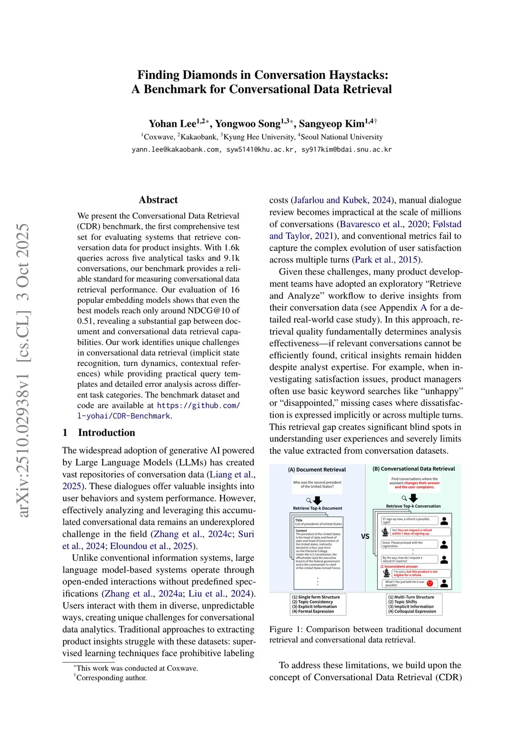 We present the Conversational Data Retrieval (CDR) benchmark, the first comprehensive test set for evaluating systems that retrieve conversation data for product insights. With 1.6k queries across five analytical tasks and 9.1k conversations, our benchmark provides a reliable standard for measuring conversational data retrieval performance. Our evaluation of 16 popular embedding models shows that even the best models reach only around NDCG@10 of 0.51, revealing a substantial gap between document and conversational data retrieval capabilities. Our work identifies unique challenges in conversational data retrieval (implicit state recognition, turn dynamics, contextual references) while providing practical query templates and detailed error analysis across different task categories. The benchmark dataset and code are available atthis https URL.