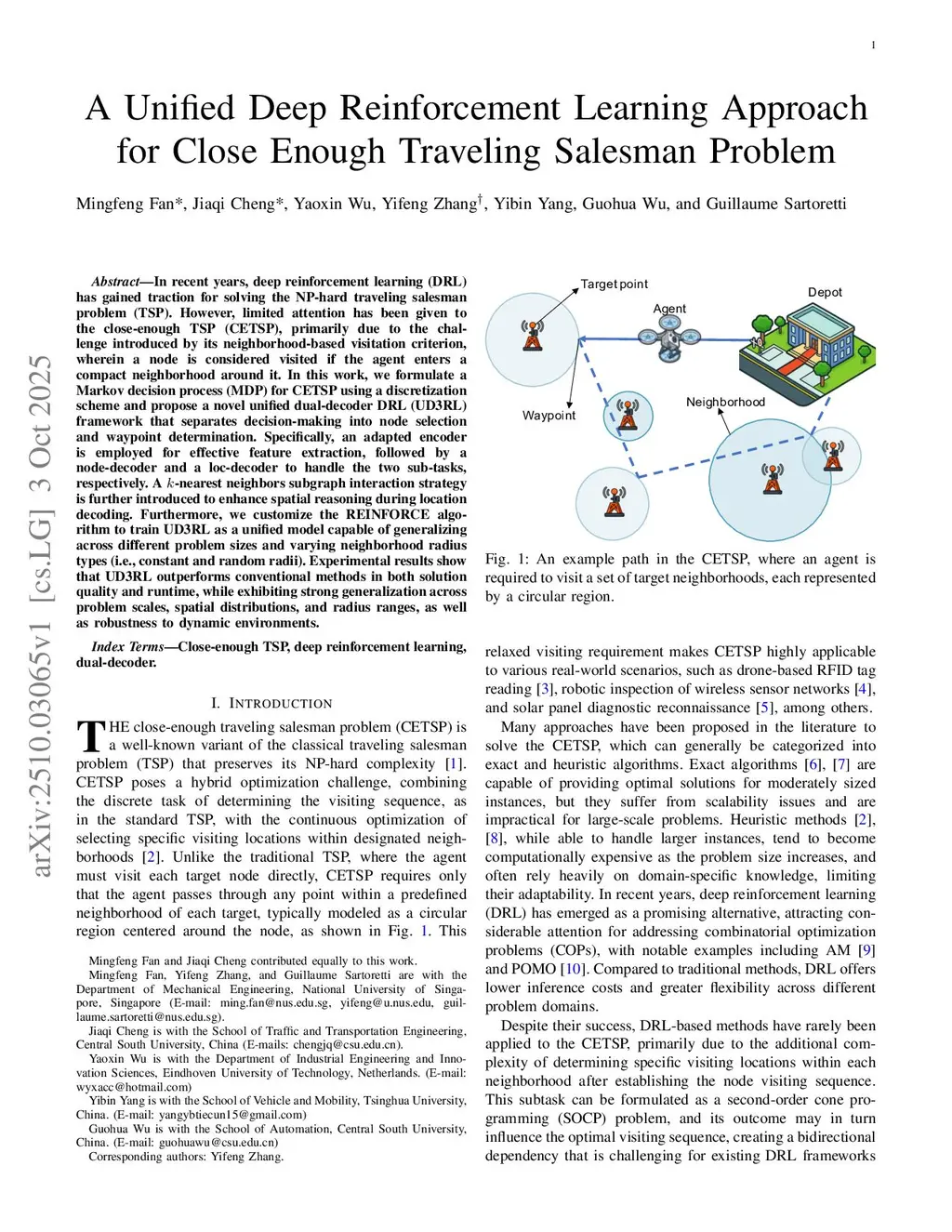 In recent years, deep reinforcement learning (DRL) has gained traction for solving the NP-hard traveling salesman problem (TSP). However, limited attention has been given to the close-enough TSP (CETSP), primarily due to the challenge introduced by its neighborhood-based visitation criterion, wherein a node is considered visited if the agent enters a compact neighborhood around it. In this work, we formulate a Markov decision process (MDP) for CETSP using a discretization scheme and propose a novel unified dual-decoder DRL (UD3RL) framework that separates decision-making into node selection and waypoint determination. Specifically, an adapted encoder is employed for effective feature extraction, followed by a node-decoder and a loc-decoder to handle the two sub-tasks, respectively. A k-nearest neighbors subgraph interaction strategy is further introduced to enhance spatial reasoning during location decoding. Furthermore, we customize the REINFORCE algorithm to train UD3RL as a unified model capable of generalizing across different problem sizes and varying neighborhood radius types (i.e., constant and random radii). Experimental results show that UD3RL outperforms conventional methods in both solution quality and runtime, while exhibiting strong generalization across problem scales, spatial distributions, and radius ranges, as well as robustness to dynamic environments.