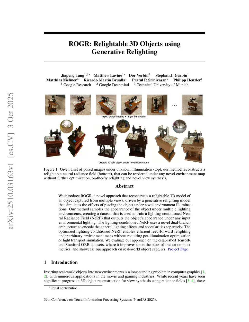 We introduce ROGR, a novel approach that reconstructs a relightable 3D model of an object captured from multiple views, driven by a generative relighting model that simulates the effects of placing the object under novel environment illuminations. Our method samples the appearance of the object under multiple lighting environments, creating a dataset that is used to train a lighting-conditioned Neural Radiance Field (NeRF) that outputs the object's appearance under any input environmental lighting. The lighting-conditioned NeRF uses a novel dual-branch architecture to encode the general lighting effects and specularities separately. The optimized lighting-conditioned NeRF enables efficient feed-forward relighting under arbitrary environment maps without requiring per-illumination optimization or light transport simulation. We evaluate our approach on the established TensoIR and Stanford-ORB datasets, where it improves upon the state-of-the-art on most metrics, and showcase our approach on real-world object captures.