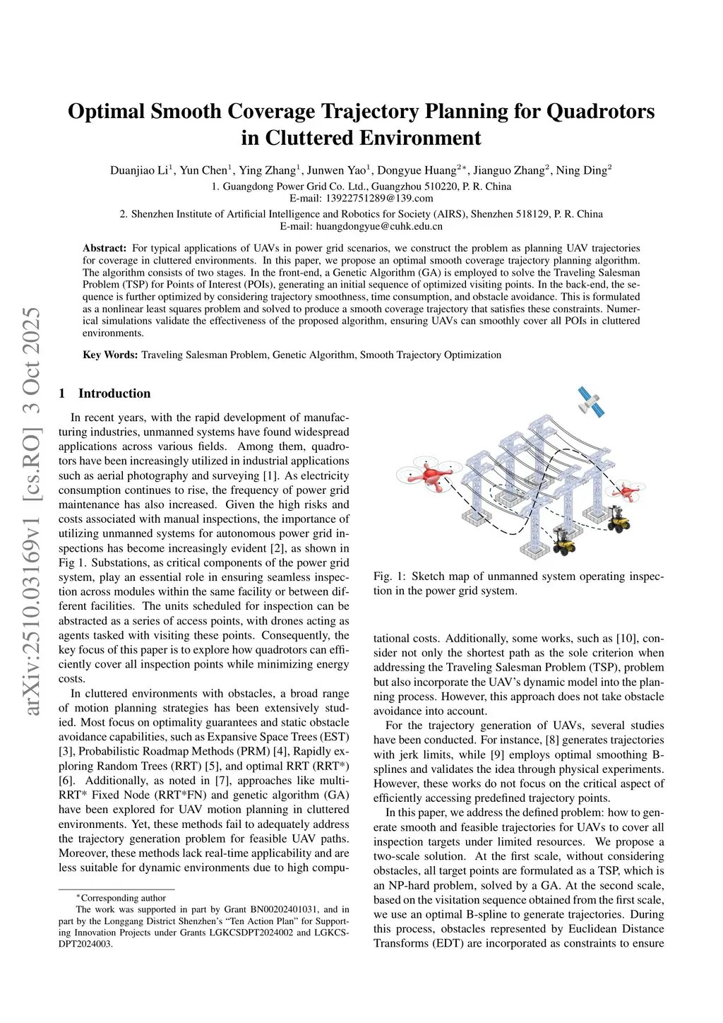 For typical applications of UAVs in power grid scenarios, we construct the problem as planning UAV trajectories for coverage in cluttered environments. In this paper, we propose an optimal smooth coverage trajectory planning algorithm. The algorithm consists of two stages. In the front-end, a Genetic Algorithm (GA) is employed to solve the Traveling Salesman Problem (TSP) for Points of Interest (POIs), generating an initial sequence of optimized visiting points. In the back-end, the sequence is further optimized by considering trajectory smoothness, time consumption, and obstacle avoidance. This is formulated as a nonlinear least squares problem and solved to produce a smooth coverage trajectory that satisfies these constraints. Numerical simulations validate the effectiveness of the proposed algorithm, ensuring UAVs can smoothly cover all POIs in cluttered environments.
