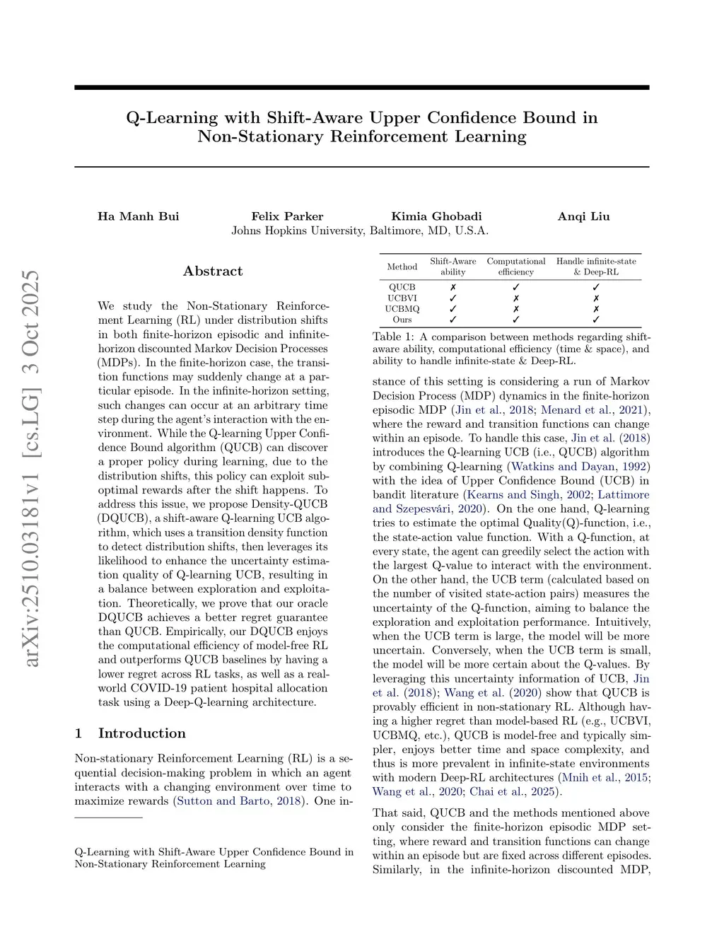 We study the Non-Stationary Reinforcement Learning (RL) under distribution shifts in both finite-horizon episodic and infinite-horizon discounted Markov Decision Processes (MDPs). In the finite-horizon case, the transition functions may suddenly change at a particular episode. In the infinite-horizon setting, such changes can occur at an arbitrary time step during the agent's interaction with the environment. While the Q-learning Upper Confidence Bound algorithm (QUCB) can discover a proper policy during learning, due to the distribution shifts, this policy can exploit sub-optimal rewards after the shift happens. To address this issue, we propose Density-QUCB (DQUCB), a shift-aware Q-learning~UCB algorithm, which uses a transition density function to detect distribution shifts, then leverages its likelihood to enhance the uncertainty estimation quality of Q-learning~UCB, resulting in a balance between exploration and exploitation. Theoretically, we prove that our oracle DQUCB achieves a better regret guarantee than QUCB. Empirically, our DQUCB enjoys the computational efficiency of model-free RL and outperforms QUCB baselines by having a lower regret across RL tasks, as well as a real-world COVID-19 patient hospital allocation task using a Deep-Q-learning architecture.