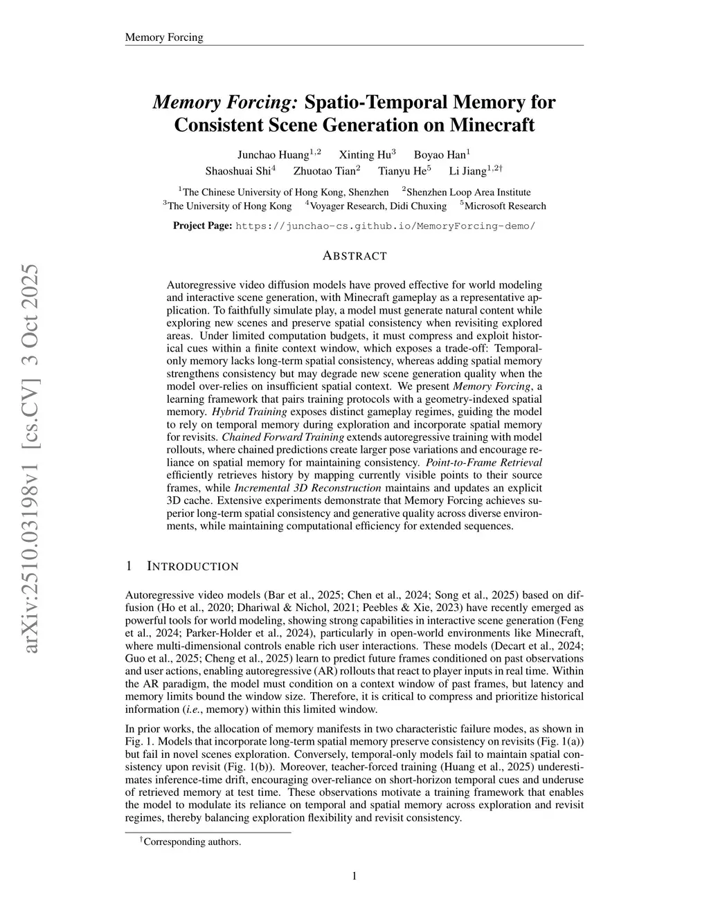 Memory Forcing: Spatio-Temporal Memory for Consistent Scene Generation on Minecraft