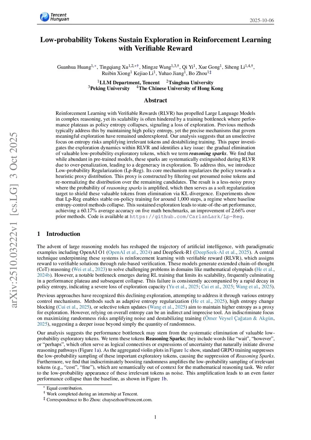 Reinforcement Learning with Verifiable Rewards (RLVR) has propelled Large Language Models in complex reasoning, yet its scalability is often hindered by a training bottleneck where performance plateaus as policy entropy collapses, signaling a loss of exploration. Previous methods typically address this by maintaining high policy entropy, yet the precise mechanisms that govern meaningful exploration have remained underexplored. Our analysis suggests that an unselective focus on entropy risks amplifying irrelevant tokens and destabilizing training. This paper investigates the exploration dynamics within RLVR and identifies a key issue: the gradual elimination of valuable low-probability exploratory tokens, which we term \textbf{\textit{reasoning sparks}}. We find that while abundant in pre-trained models, these sparks are systematically extinguished during RLVR due to over-penalization, leading to a degeneracy in exploration. To address this, we introduce Low-probability Regularization (Lp-Reg). Its core mechanism regularizes the policy towards a heuristic proxy distribution. This proxy is constructed by filtering out presumed noise tokens and re-normalizing the distribution over the remaining candidates. The result is a less-noisy proxy where the probability of \textit{reasoning sparks} is amplified, which then serves as a soft regularization target to shield these valuable tokens from elimination via KL divergence. Experiments show that Lp-Reg enables stable on-policy RL, sustaining continuous scaling across training steps and GPU-hours, where baseline entropy-control methods collapse. This sustained exploration leads to state-of-the-art performance, achieving a average accuracy on five math benchmarks, an improvement of over prior methods. Code is available atthis https URL.