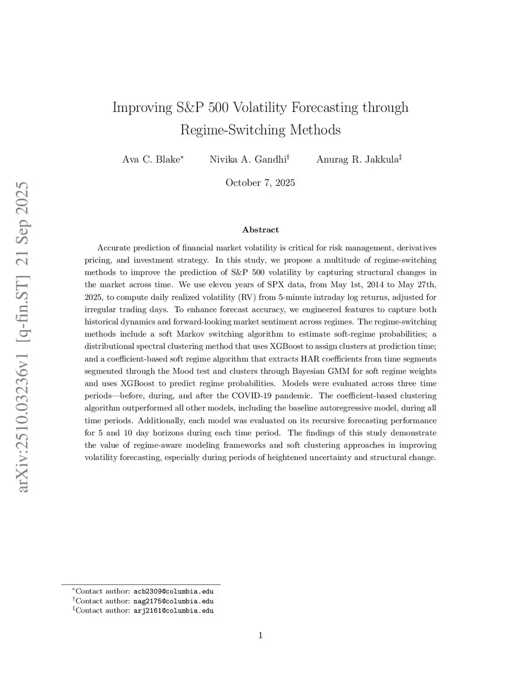 Accurate prediction of financial market volatility is critical for risk management, derivatives pricing, and investment strategy. In this study, we propose a multitude of regime-switching methods to improve the prediction of S&P 500 volatility by capturing structural changes in the market across time. We use eleven years of SPX data, from May 1st, 2014 to May 27th, 2025, to compute daily realized volatility (RV) from 5-minute intraday log returns, adjusted for irregular trading days. To enhance forecast accuracy, we engineered features to capture both historical dynamics and forward-looking market sentiment across regimes. The regime-switching methods include a soft Markov switching algorithm to estimate soft-regime probabilities, a distributional spectral clustering method that uses XGBoost to assign clusters at prediction time, and a coefficient-based soft regime algorithm that extracts HAR coefficients from time segments segmented through the Mood test and clusters through Bayesian GMM for soft regime weights, using XGBoost to predict regime probabilities. Models were evaluated across three time periods--before, during, and after the COVID-19 pandemic. The coefficient-based clustering algorithm outperformed all other models, including the baseline autoregressive model, during all time periods. Additionally, each model was evaluated on its recursive forecasting performance for 5- and 10-day horizons during each time period. The findings of this study demonstrate the value of regime-aware modeling frameworks and soft clustering approaches in improving volatility forecasting, especially during periods of heightened uncertainty and structural change.