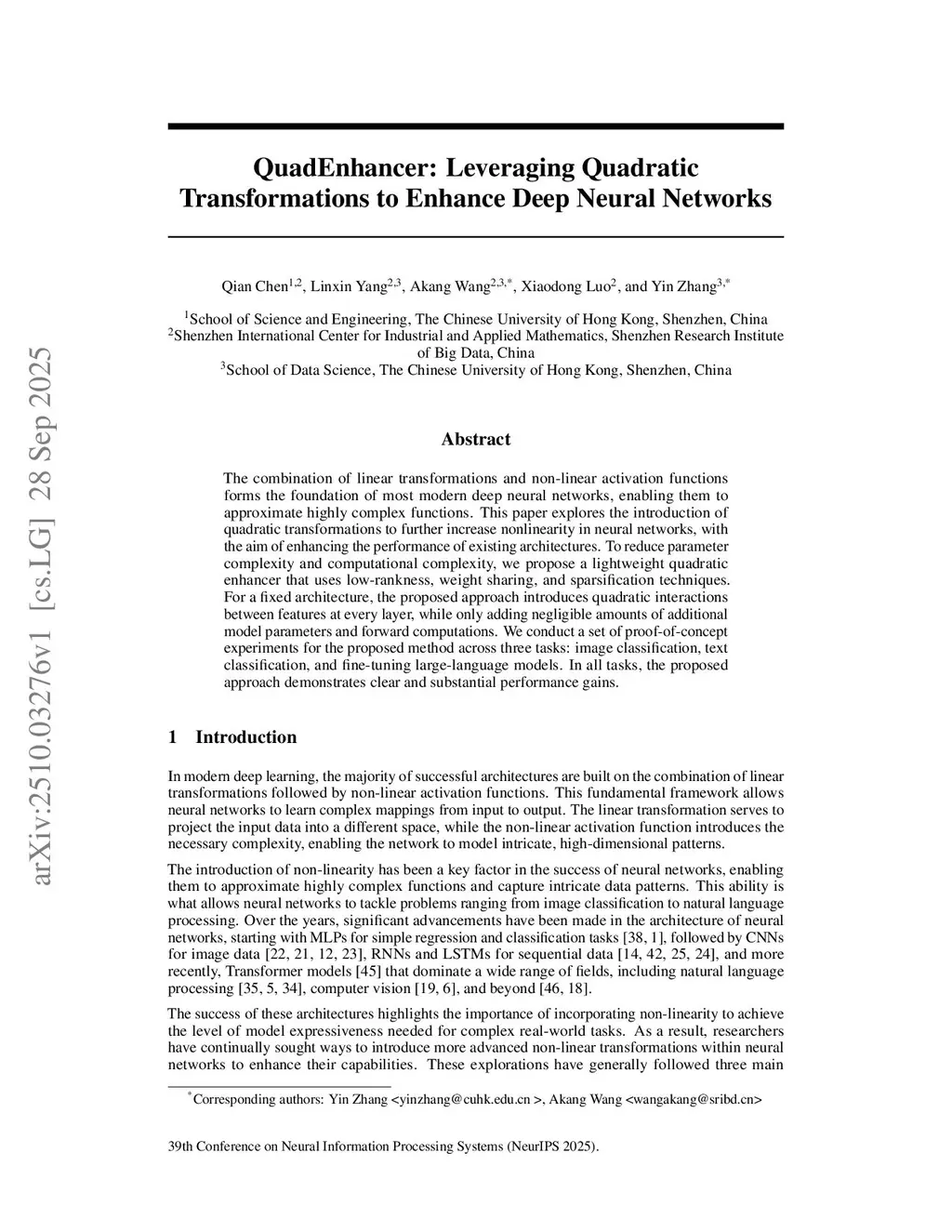 The combination of linear transformations and non-linear activation functions forms the foundation of most modern deep neural networks, enabling them to approximate highly complex functions. This paper explores the introduction of quadratic transformations to further increase nonlinearity in neural networks, with the aim of enhancing the performance of existing architectures. To reduce parameter complexity and computational complexity, we propose a lightweight quadratic enhancer that uses low-rankness, weight sharing, and sparsification techniques. For a fixed architecture, the proposed approach introduces quadratic interactions between features at every layer, while only adding negligible amounts of additional model parameters and forward computations. We conduct a set of proof-of-concept experiments for the proposed method across three tasks: image classification, text classification, and fine-tuning large-language models. In all tasks, the proposed approach demonstrates clear and substantial performance gains.