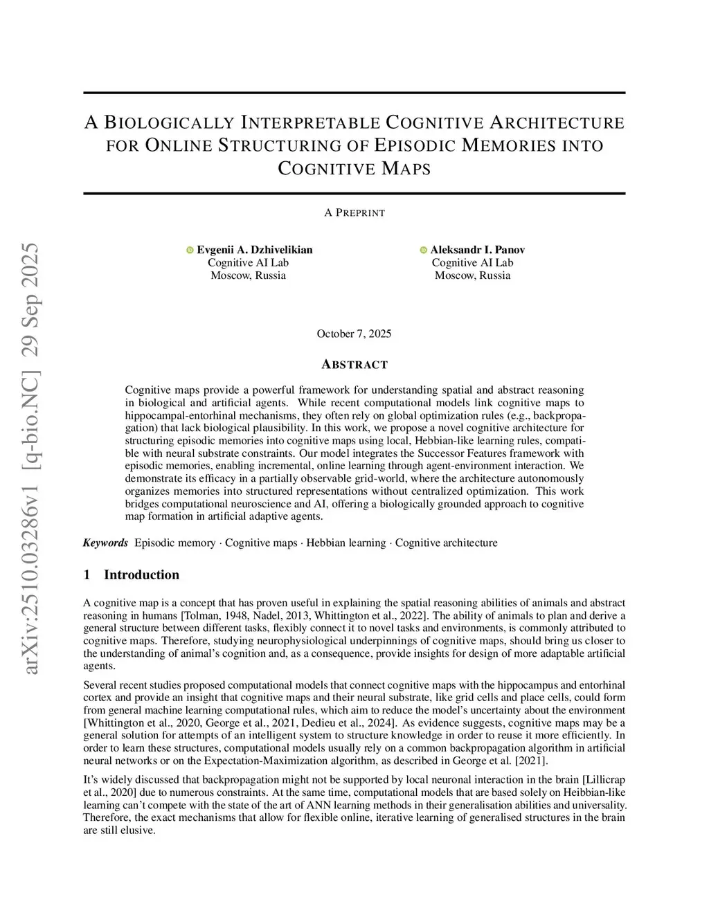 A Biologically Interpretable Cognitive Architecture for Online Structuring of Episodic Memories into Cognitive Maps