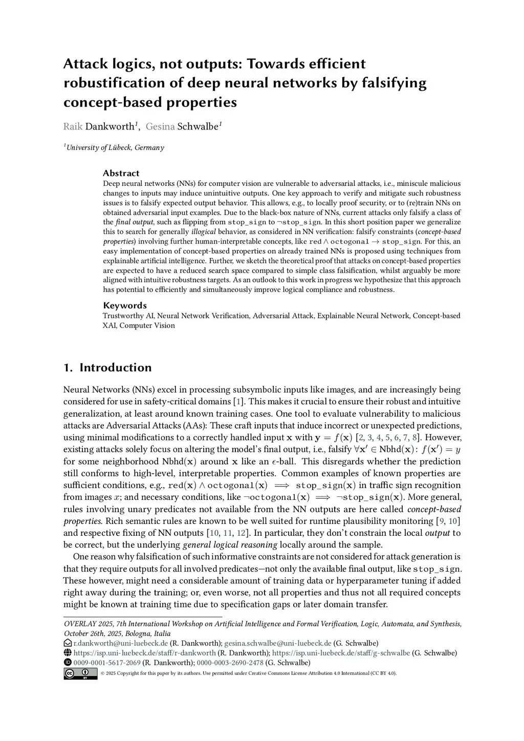 Deep neural networks (NNs) for computer vision are vulnerable to adversarial attacks, i.e., miniscule malicious changes to inputs may induce unintuitive outputs. One key approach to verify and mitigate such robustness issues is to falsify expected output behavior. This allows, e.g., to locally proof security, or to (re)train NNs on obtained adversarial input examples. Due to the black-box nature of NNs, current attacks only falsify a class of the final output, such as flipping from \texttt{stop_sign} to \neg\texttt{stop_sign}. In this short position paper we generalize this to search for generally illogical behavior, as considered in NN verification: falsify constraints (concept-based properties) involving further human-interpretable concepts, like \texttt{red}\wedge\texttt{octogonal}\rightarrow\texttt{stop_sign}. For this, an easy implementation of concept-based properties on already trained NNs is proposed using techniques from explainable artificial intelligence. Further, we sketch the theoretical proof that attacks on concept-based properties are expected to have a reduced search space compared to simple class falsification, whilst arguably be more aligned with intuitive robustness targets. As an outlook to this work in progress we hypothesize that this approach has potential to efficiently and simultaneously improve logical compliance and robustness.
