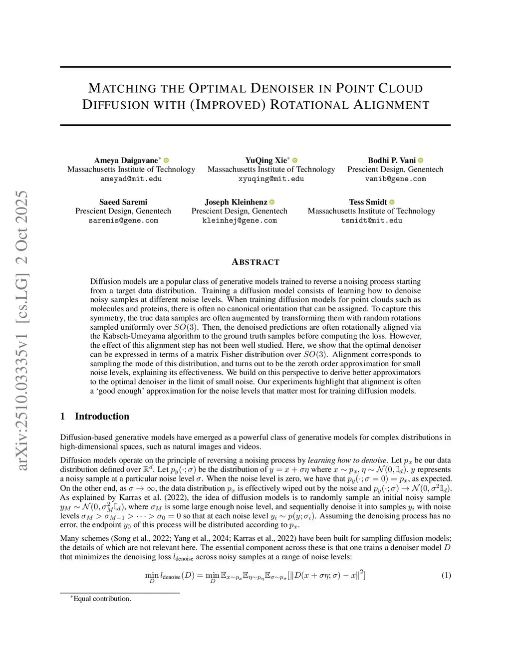 Diffusion models are a popular class of generative models trained to reverse a noising process starting from a target data distribution. Training a diffusion model consists of learning how to denoise noisy samples at different noise levels. When training diffusion models for point clouds such as molecules and proteins, there is often no canonical orientation that can be assigned. To capture this symmetry, the true data samples are often augmented by transforming them with random rotations sampled uniformly over . Then, the denoised predictions are often rotationally aligned via the Kabsch-Umeyama algorithm to the ground truth samples before computing the loss. However, the effect of this alignment step has not been well studied. Here, we show that the optimal denoiser can be expressed in terms of a matrix Fisher distribution over . Alignment corresponds to sampling the mode of this distribution, and turns out to be the zeroth order approximation for small noise levels, explaining its effectiveness. We build on this perspective to derive better approximators to the optimal denoiser in the limit of small noise. Our experiments highlight that alignment is often a `good enough' approximation for the noise levels that matter most for training diffusion models.
