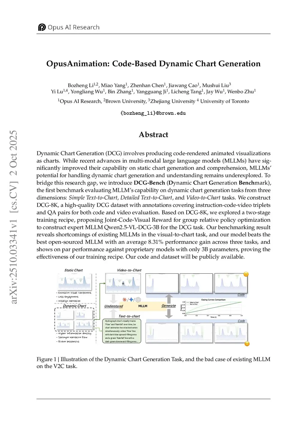 Dynamic Chart Generation (DCG) involves producing code-rendered animated visualizations as charts. While recent advances in multi-modal large language models (MLLMs) have significantly improved their capability on static chart generation and comprehension, MLLMs' potential for handling dynamic chart generation and understanding remains underexplored. To bridge this research gap, we introduce DCG-Bench (Dynamic Chart Generation Benchmark), the first benchmark evaluating MLLM's capability on dynamic chart generation tasks from three dimensions: Simple Text-to-Chart, Detailed Text-to-Chart, and Video-to-Chart tasks. We construct DCG-8K, a high-quality DCG dataset with annotations covering instruction-code-video triplets and QA pairs for both code and video evaluation. Based on DCG-8K, we explored a two-stage training recipe, proposing Joint-Code-Visual Reward for group relative policy optimization to construct expert MLLM Qwen2.5-VL-DCG-3B for the DCG task. Our benchmarking result reveals shortcomings of existing MLLMs in the visual-to-chart task, and our model beats the best open-sourced MLLM with an average 8.31% performance gain across three tasks, and shows on par performance against proprietary models with only 3B parameters, proving the effectiveness of our training recipe. Our code and dataset will be publicly available.