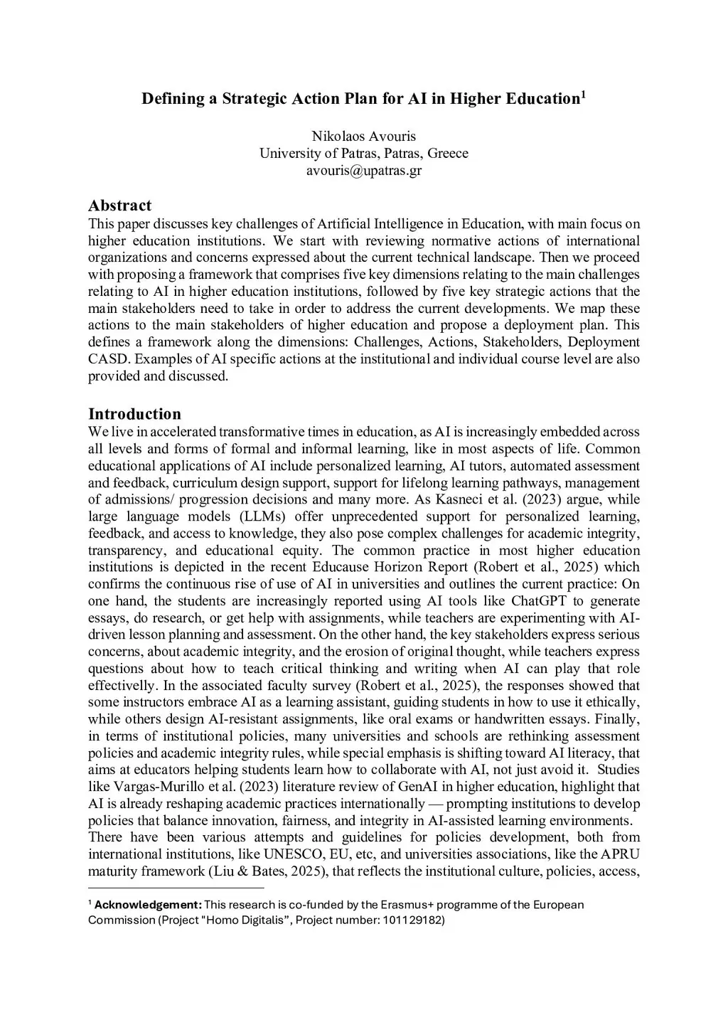 This paper discusses key challenges of Artificial Intelligence in Education, with main focus on higher education institutions. We start with reviewing normative actions of international organizations and concerns expressed about the current technical landscape. Then we proceed with proposing a framework that comprises five key dimensions relating to the main challenges relating to AI in higher education institutions, followed by five key strategic actions that the main stakeholders need to take in order to address the current developments. We map these actions to the main stakeholders of higher education and propose a deployment plan. This defines a framework along the dimensions: Challenges, Actions, Stakeholders, Deployment CASD. Examples of AI specific actions at the institutional and individual course level are also provided and discussed.