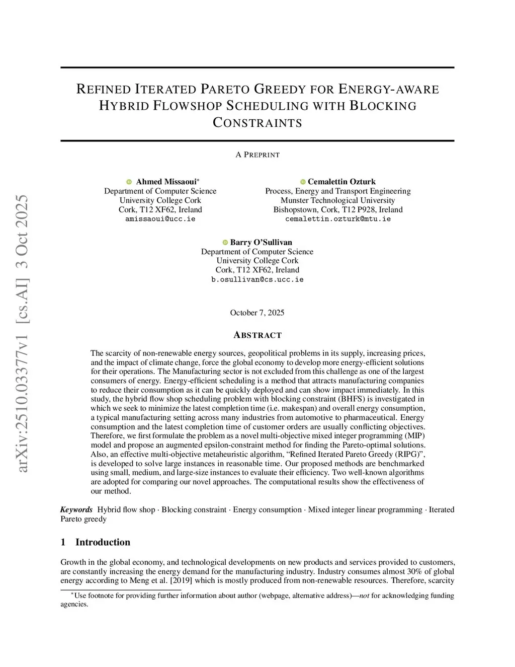 The scarcity of non-renewable energy sources, geopolitical problems in its supply, increasing prices, and the impact of climate change, force the global economy to develop more energy-efficient solutions for their operations. The Manufacturing sector is not excluded from this challenge as one of the largest consumers of energy. Energy-efficient scheduling is a method that attracts manufacturing companies to reduce their consumption as it can be quickly deployed and can show impact immediately. In this study, the hybrid flow shop scheduling problem with blocking constraint (BHFS) is investigated in which we seek to minimize the latest completion time (i.e. makespan) and overall energy consumption, a typical manufacturing setting across many industries from automotive to pharmaceutical. Energy consumption and the latest completion time of customer orders are usually conflicting objectives. Therefore, we first formulate the problem as a novel multi-objective mixed integer programming (MIP) model and propose an augmented epsilon-constraint method for finding the Pareto-optimal solutions. Also, an effective multi-objective metaheuristic algorithm. Refined Iterated Pareto Greedy (RIPG), is developed to solve large instances in reasonable time. Our proposed methods are benchmarked using small, medium, and large-size instances to evaluate their efficiency. Two well-known algorithms are adopted for comparing our novel approaches. The computational results show the effectiveness of our method.
